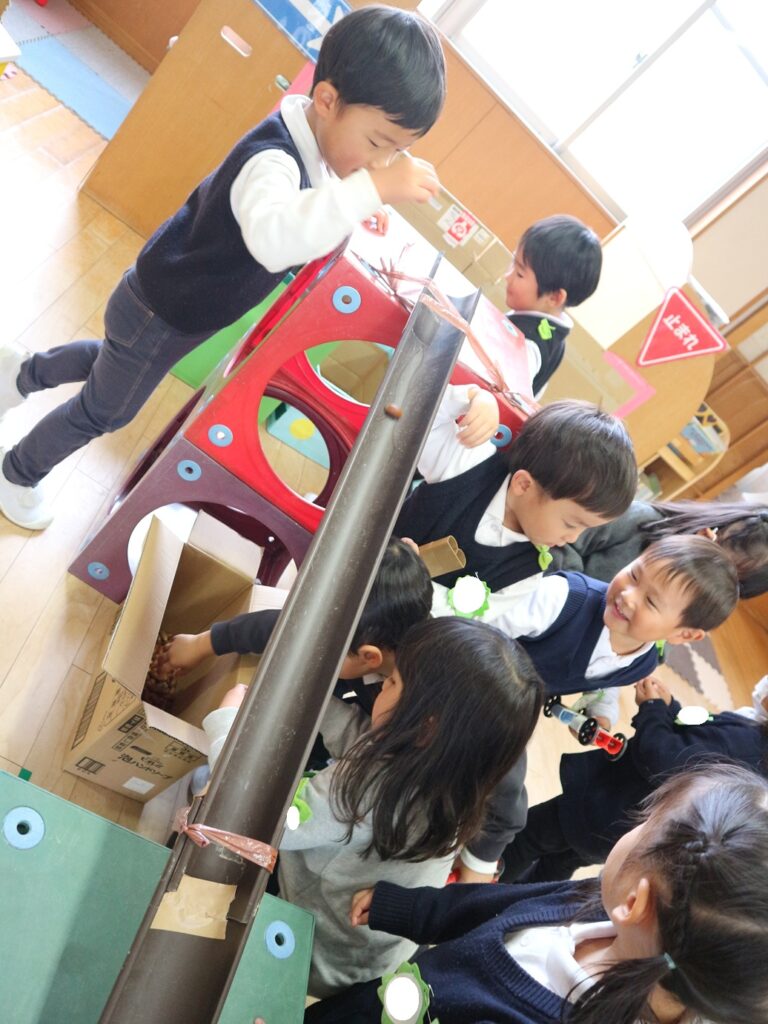 保育室では、拾ったどんぐりを滑り台にすべらせて遊んでいます。「こんなにいっぱい一気に行くよ!」と手いっぱいにどんぐりを持って滑らせる子や、一つひとつゆっくりと滑らせる子、下からどんぐりが滑ってくるのを待ち構える子、色々な楽しみ方をしています♡