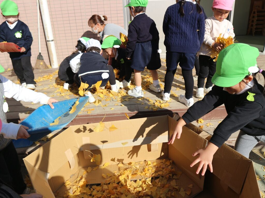 4連休明けでイチョウの葉っぱがたくさん落ちていたので、ダンボールを持ってきてイチョウのお風呂を作りました。「こんなに拾ったよ!」と両手いっぱいにイチョウを持ってきたり、砂すくいの用具を持ってきてたくさん拾ったりして、たくさんのイチョウが集まりました。
