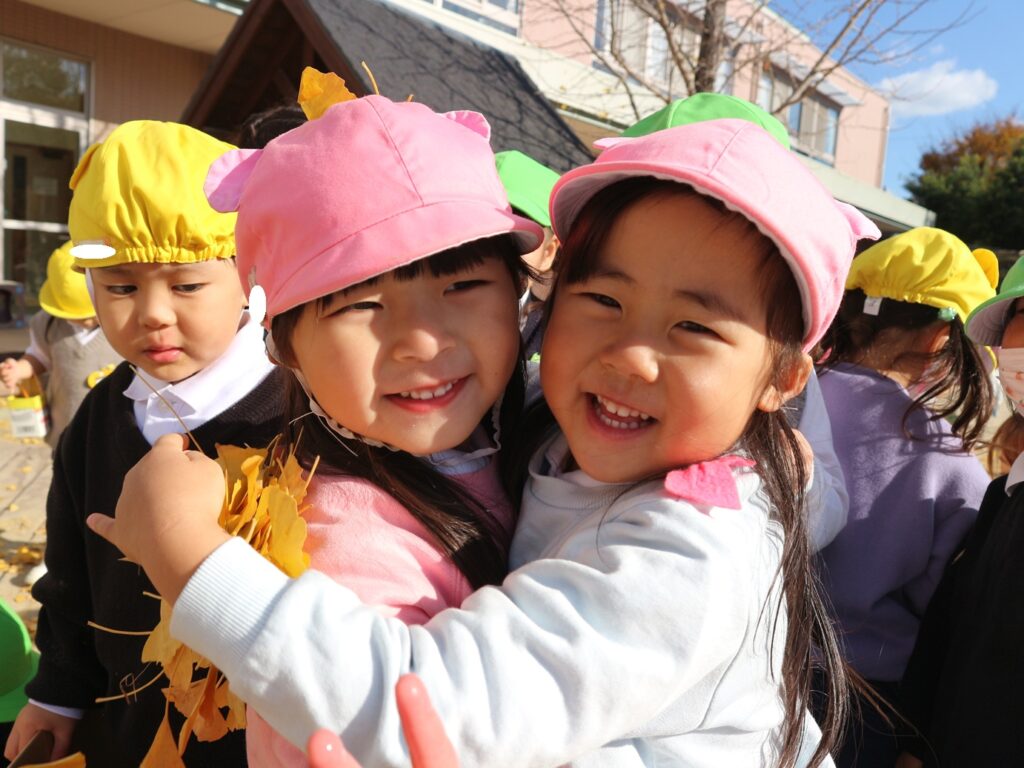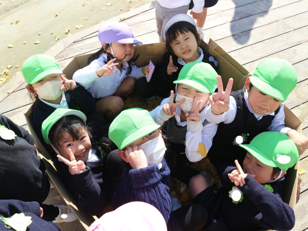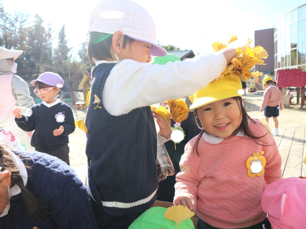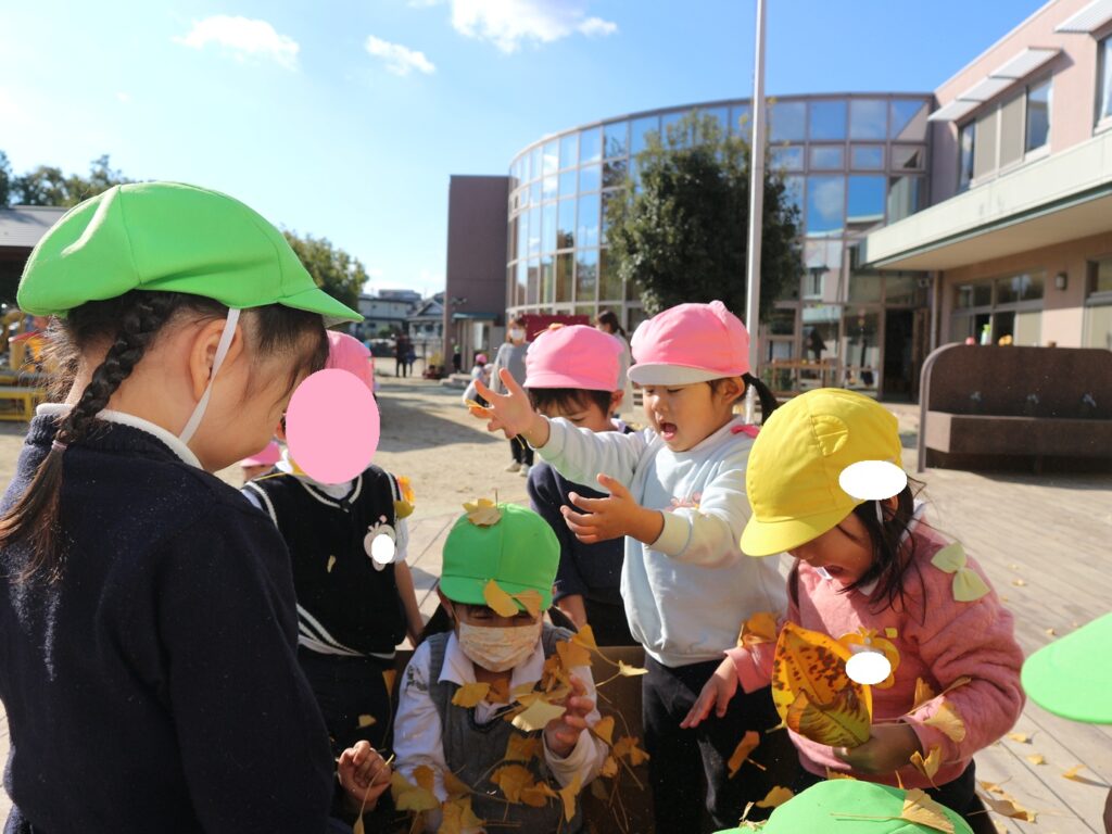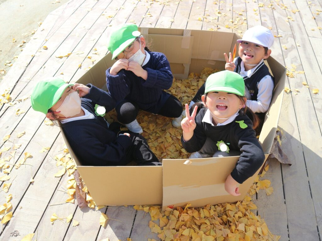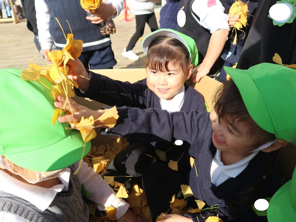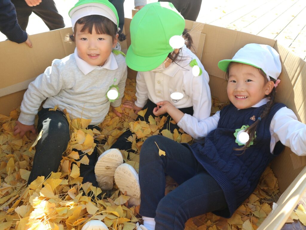 ダンボールの中に拾ったイチョウを入れてお風呂が完成すると、「なんかふかふかする!」「このお風呂気持ちいい!」と葉っぱに埋もれてみたり、イチョウで友達と頭や背中の洗いっこをしたり、たくさんの子が集まってきて、友達と一緒に楽しんでいました♪