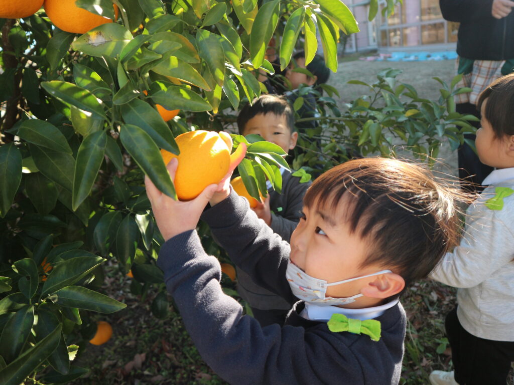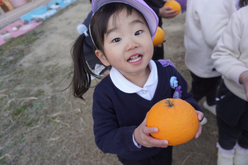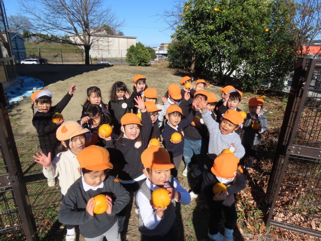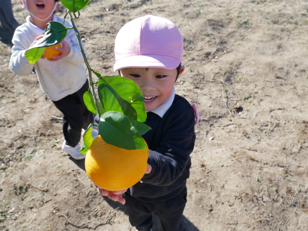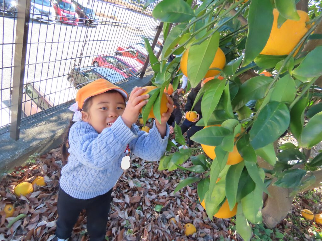今日は年少組が裏の畑で夏みかんを収穫しました。「見て!こんなに大きいよ!」と夏みかんの大きさにびっくりの子ども達。