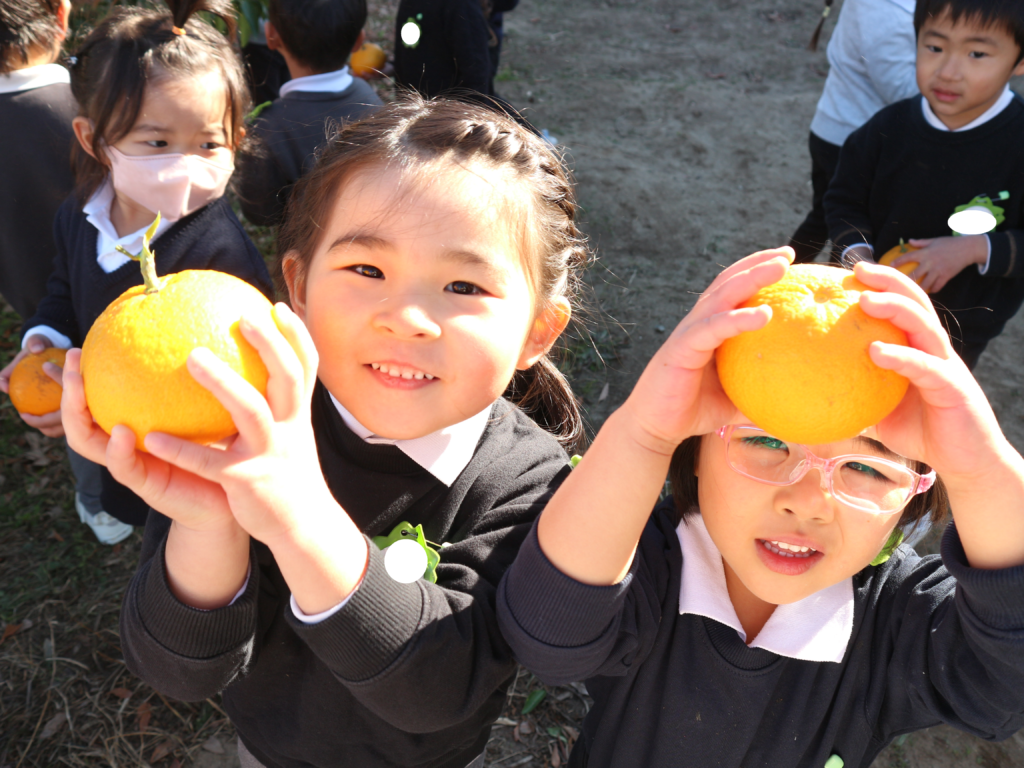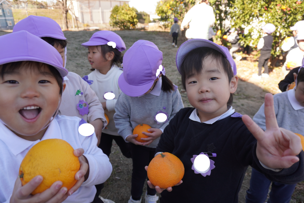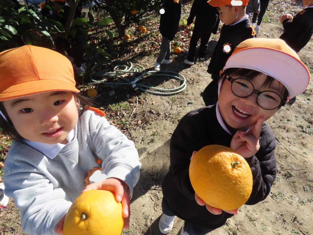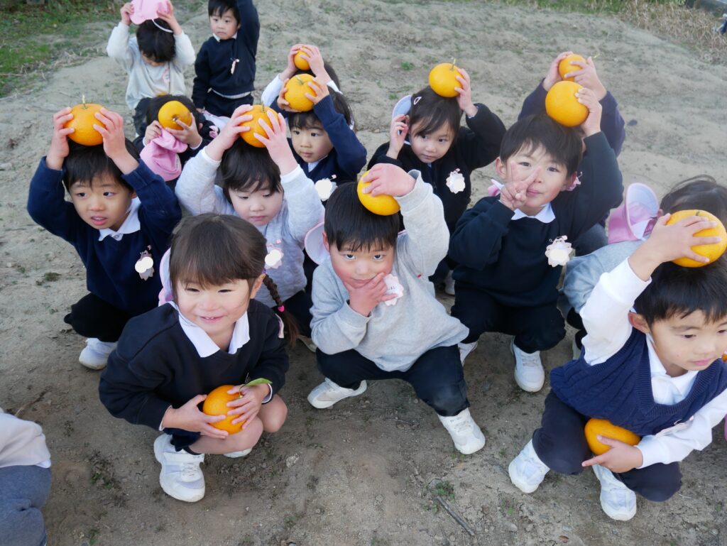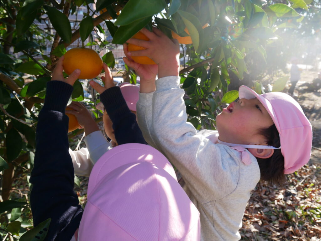 今日は年少組が裏の畑で夏みかんを収穫しました。「見て!こんなに大きいよ!」と夏みかんの大きさにびっくりの子ども達。