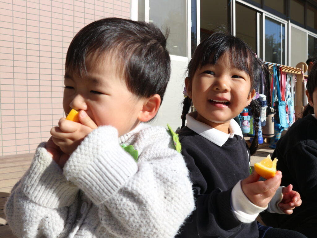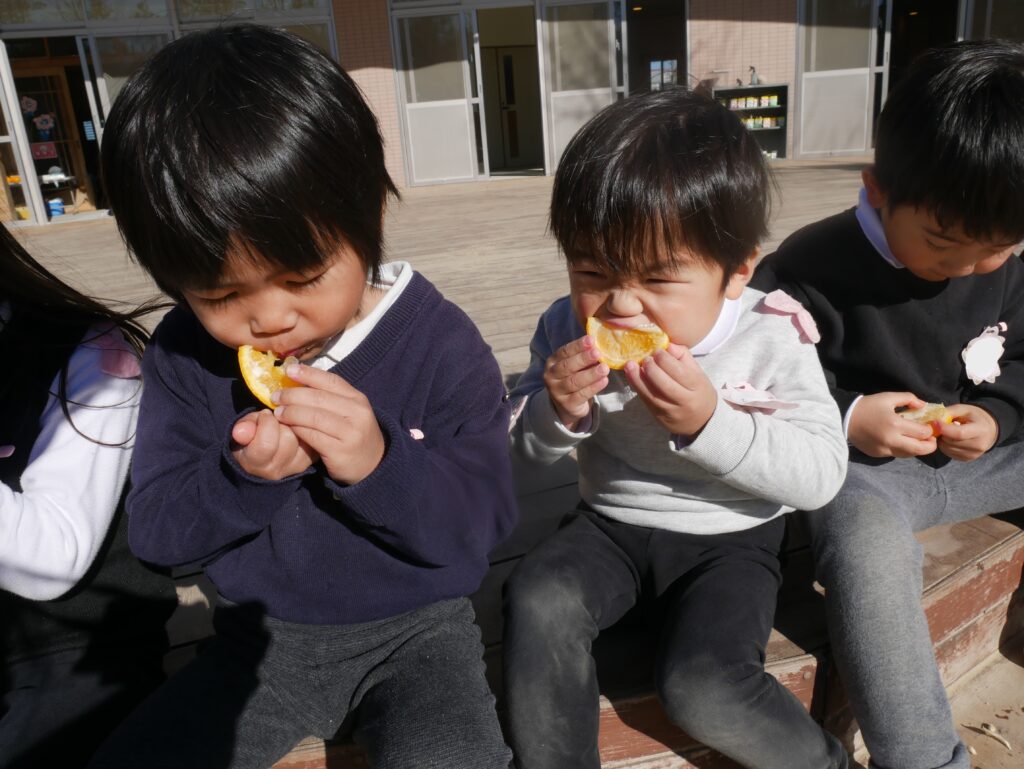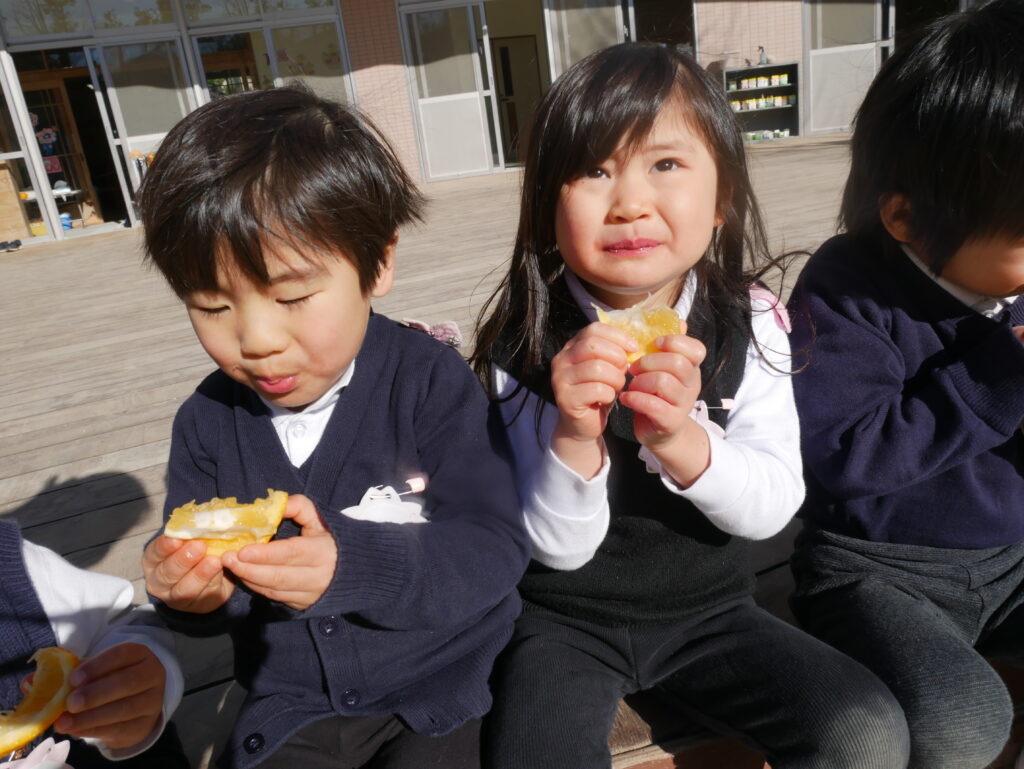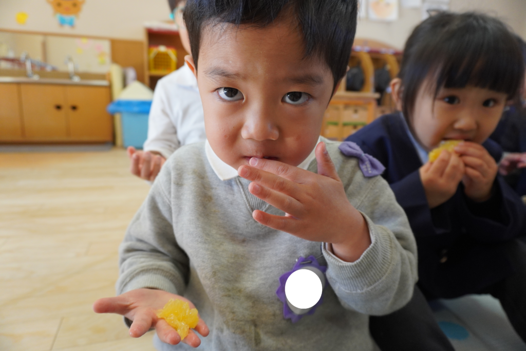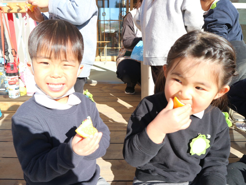 保育室に戻ってみんなで収穫した夏みかんを食べました!「ちょっとすっぱいけどおいし~い♡」と大好評でした!