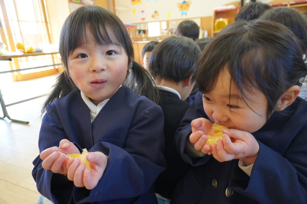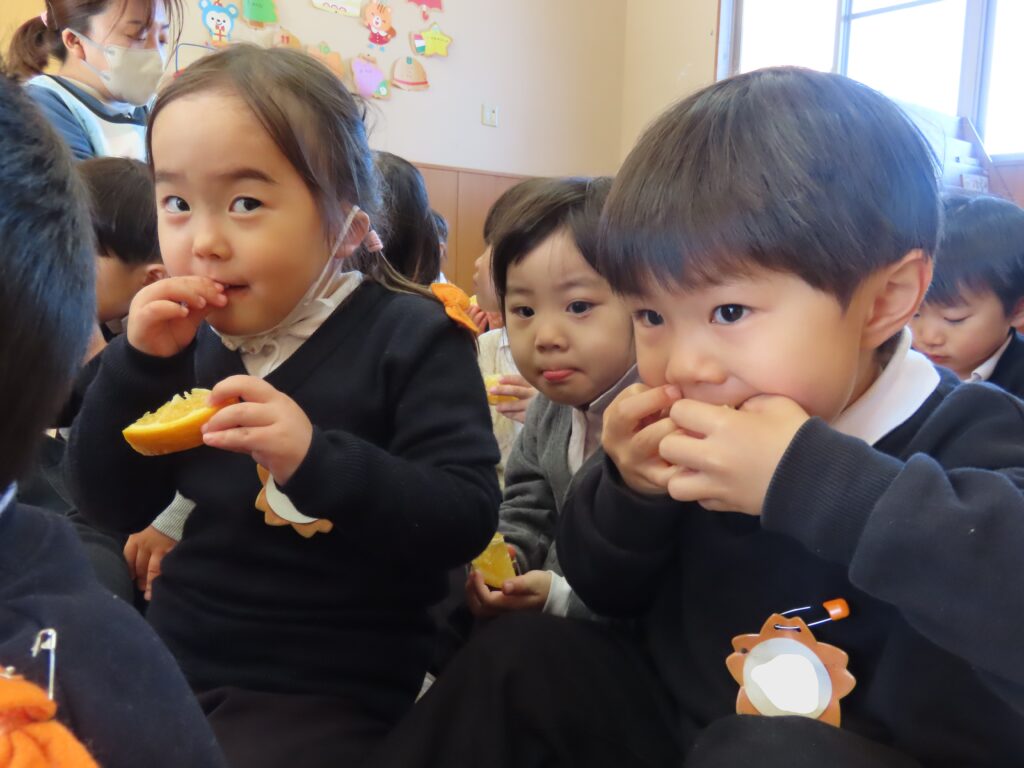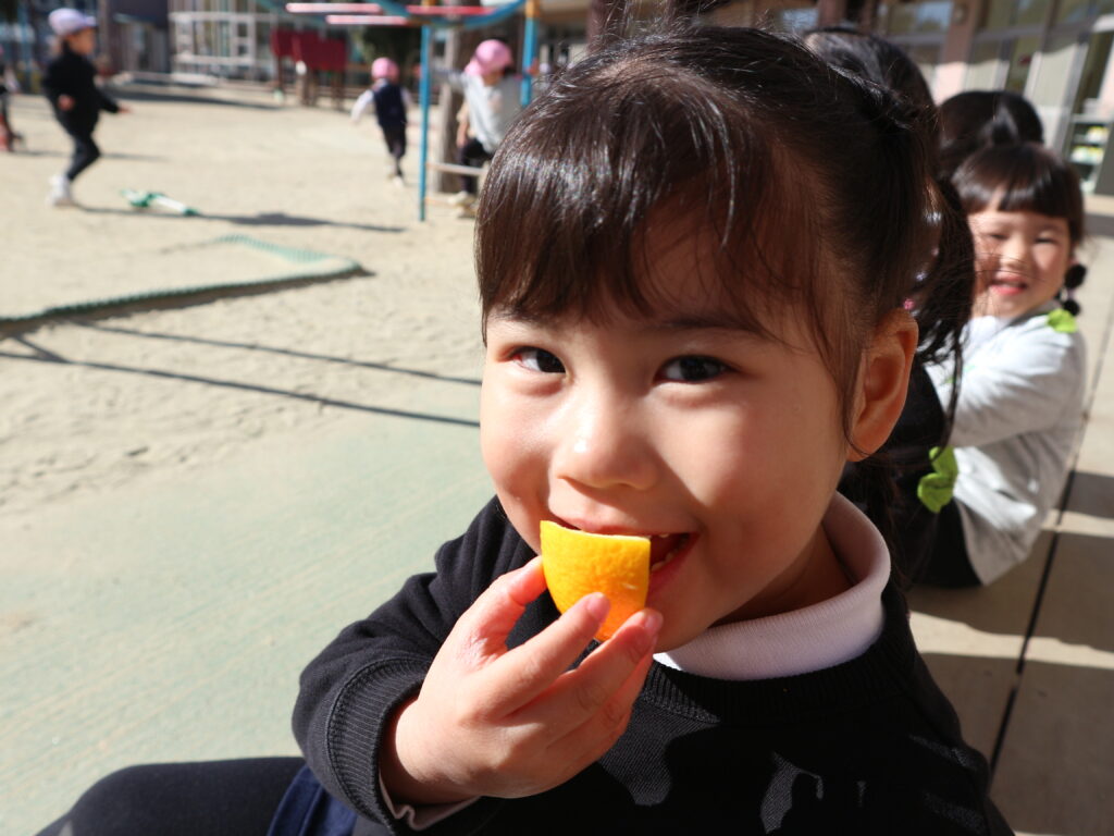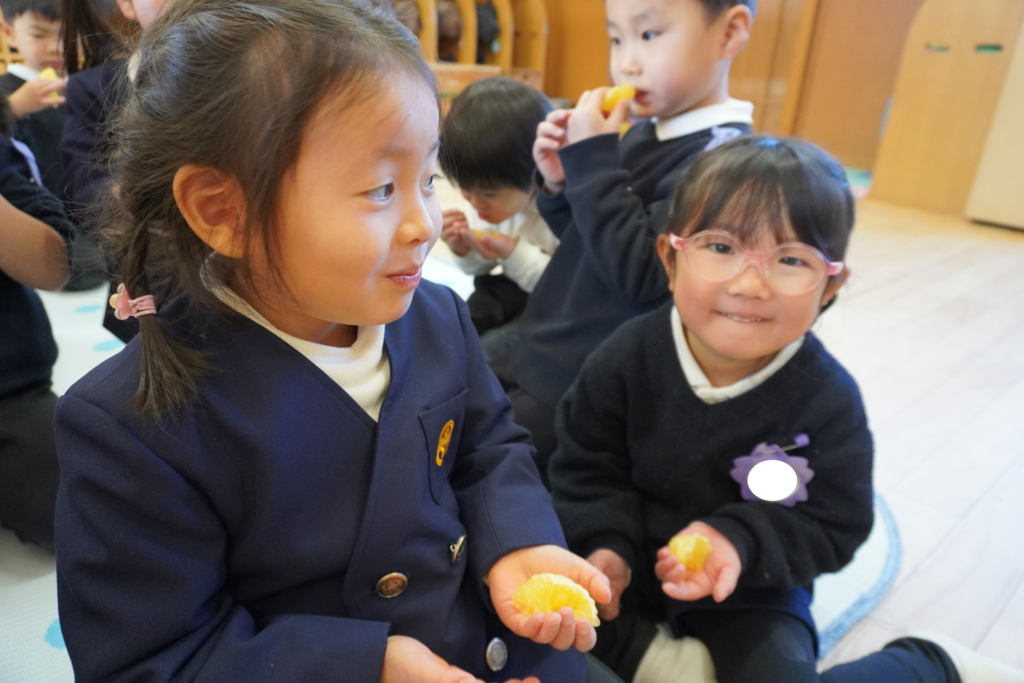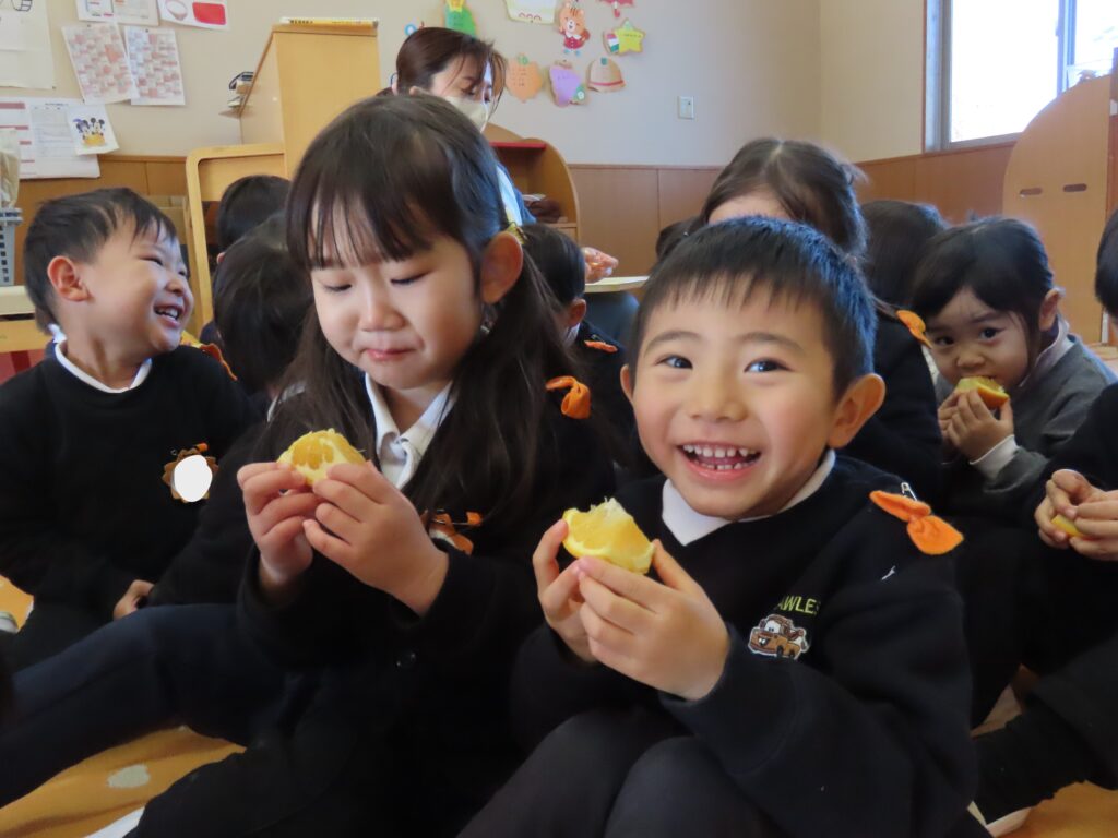 保育室に戻ってみんなで収穫した夏みかんを食べました!「ちょっとすっぱいけどおいし~い♡」と大好評でした!