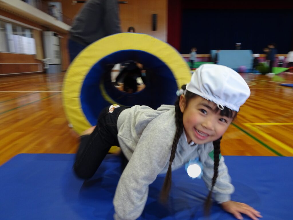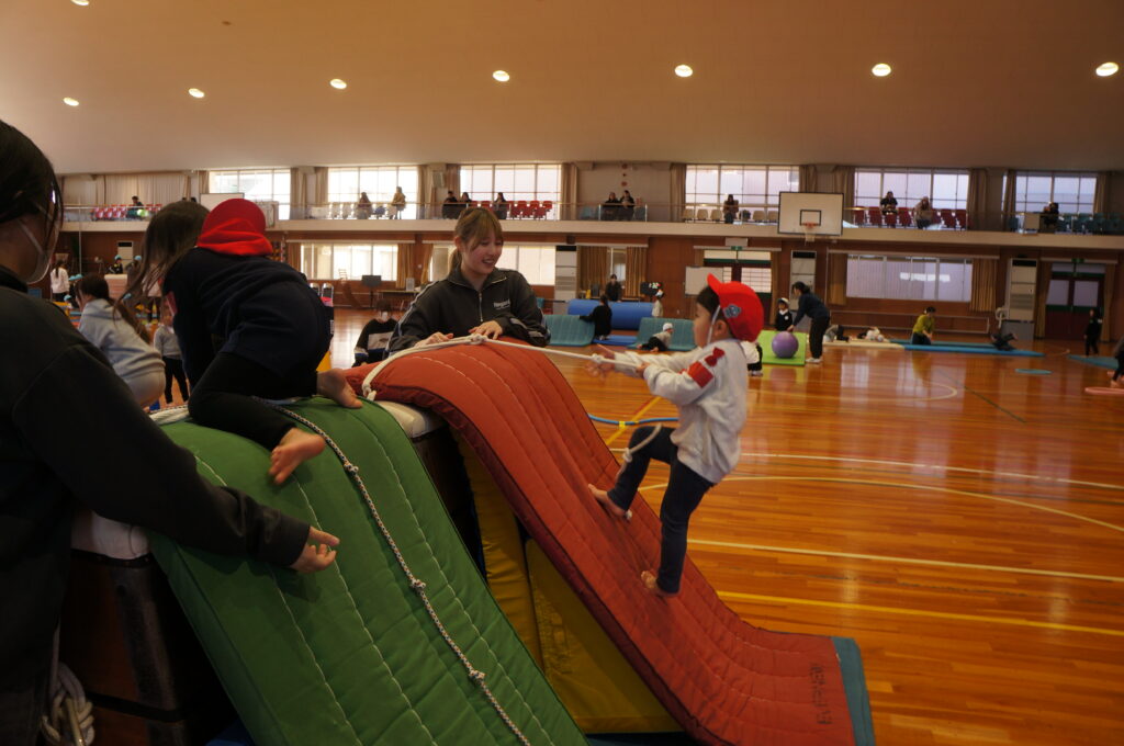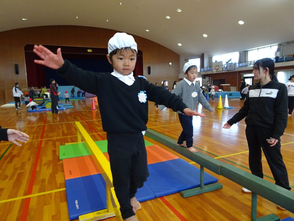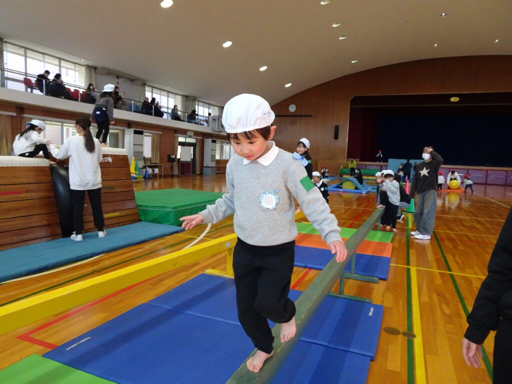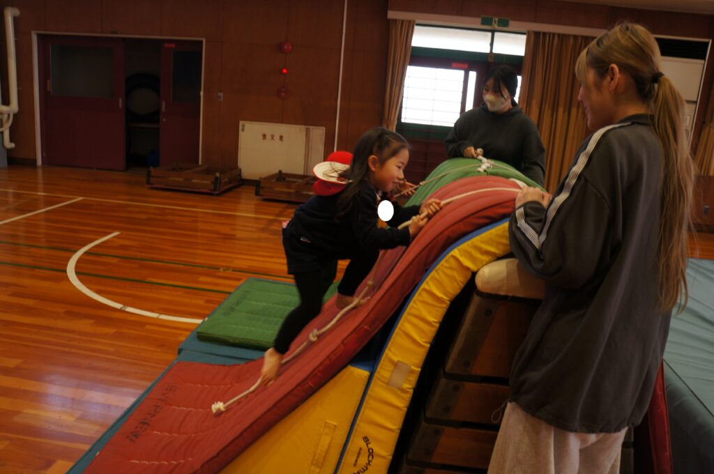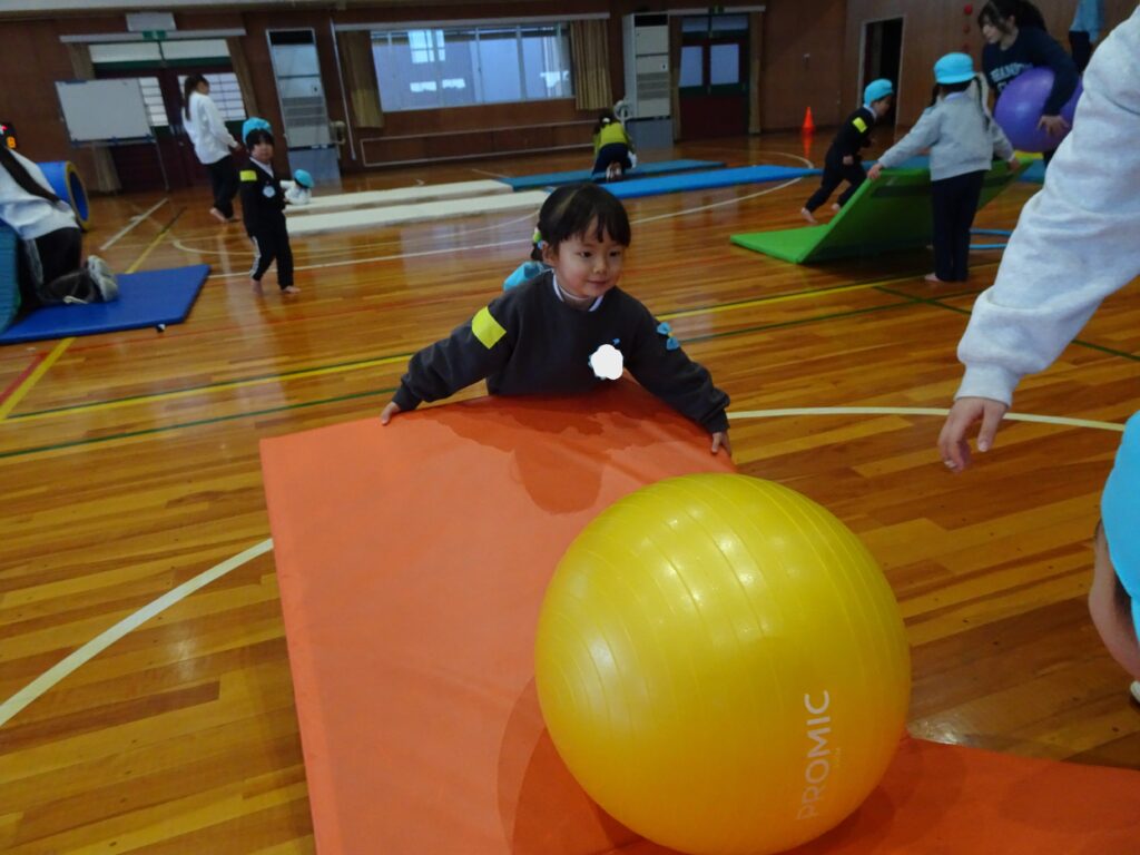 今日は大学の運動遊びの日。「はやく行きたい!」と楽しみにしていました。フラフープのコーナーで鬼遊びをしていたり、マットの坂道を登ったりと、お姉さんと楽しく遊びました。