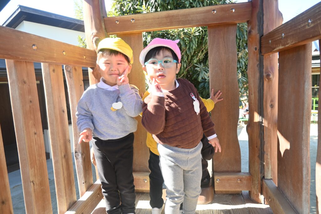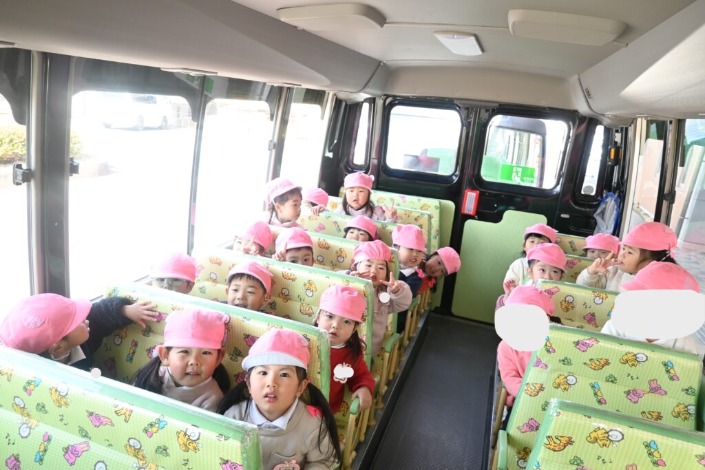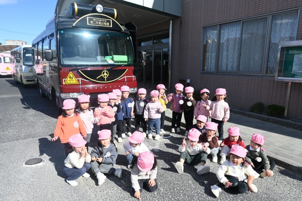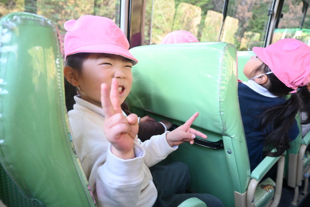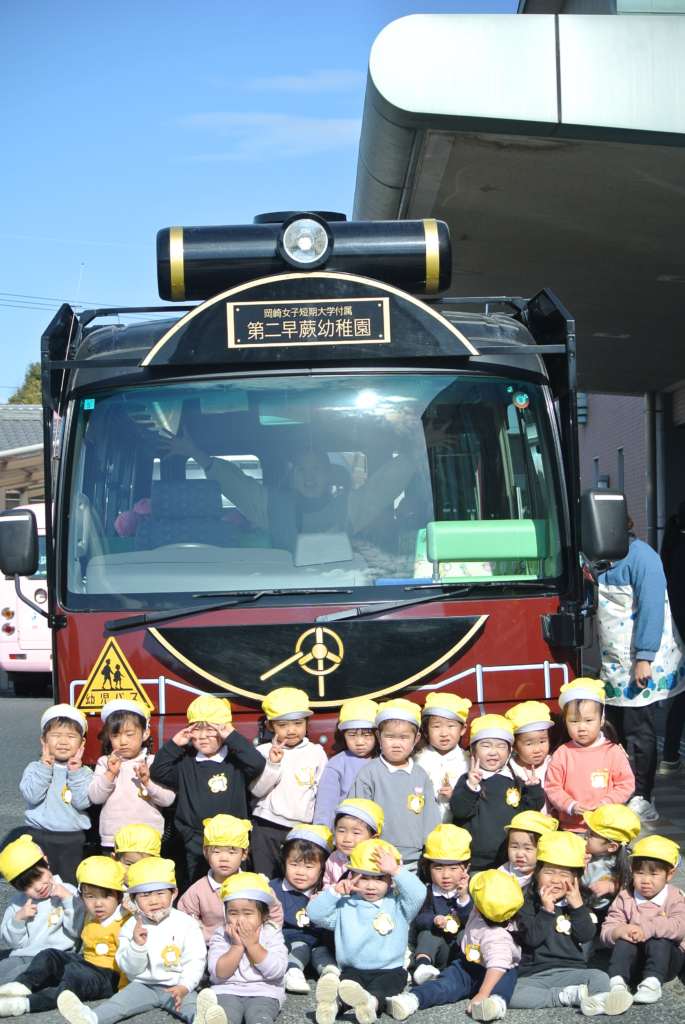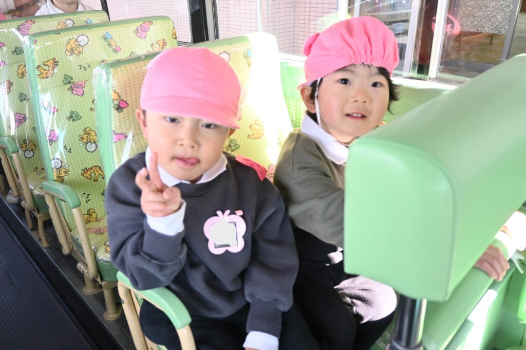 汽車バスに乗り込んで「出発進行!」と声をかけると、「今日は特別だよ」と運転手さんが「ポッポー」と汽笛を大サービス。「シュッシュッシュ」という音も鳴らして走ってくれました。汽車のようなかっこいいバスに乗って、第二早蕨幼稚園の遊具で遊んだミニミニ遠足。キラキラ輝く日差しに負けないくらいかっこいい汽車バスとピカピカ笑顔の子どもたちでした。楽しかったね。