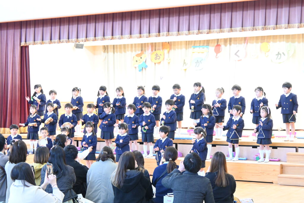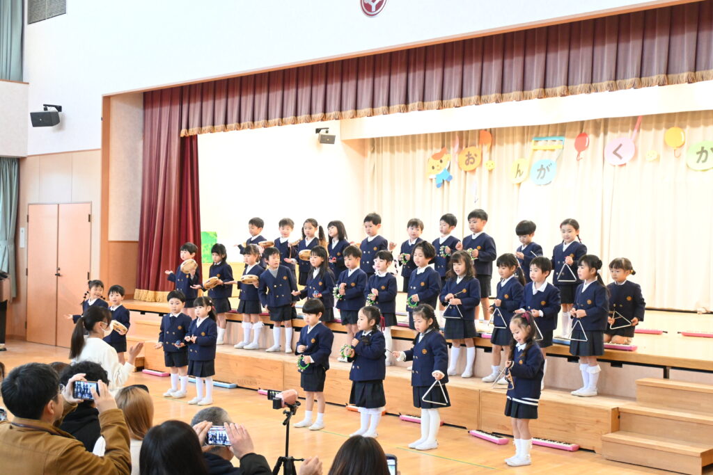 クラスみんなで、タンバリン、鈴、カスタネット、トライアングルに分かれ「じゅんびばんたんだん」を演奏しました!