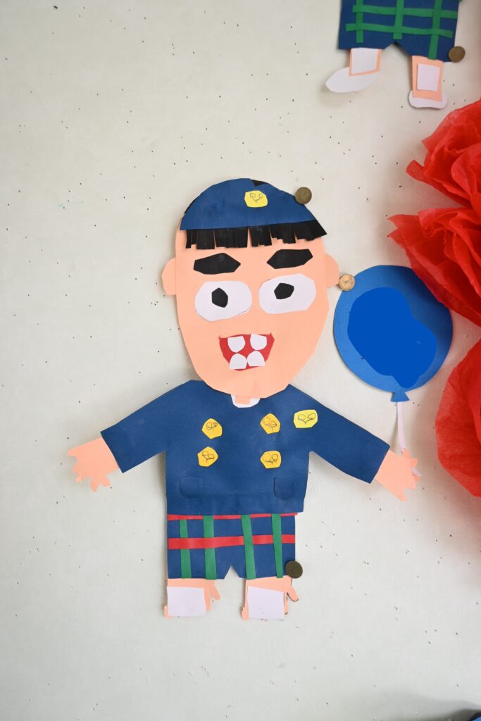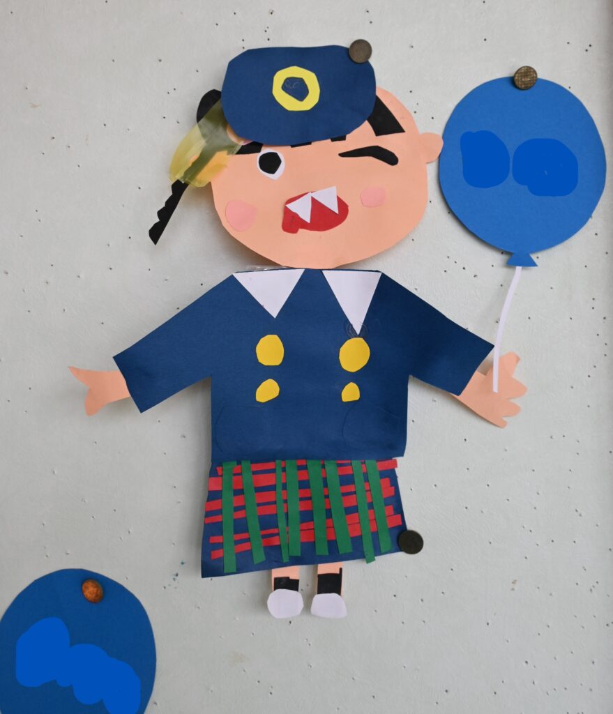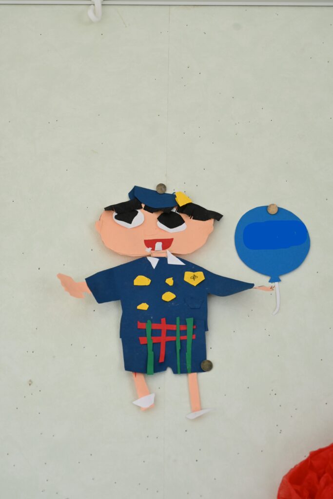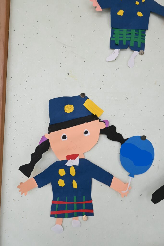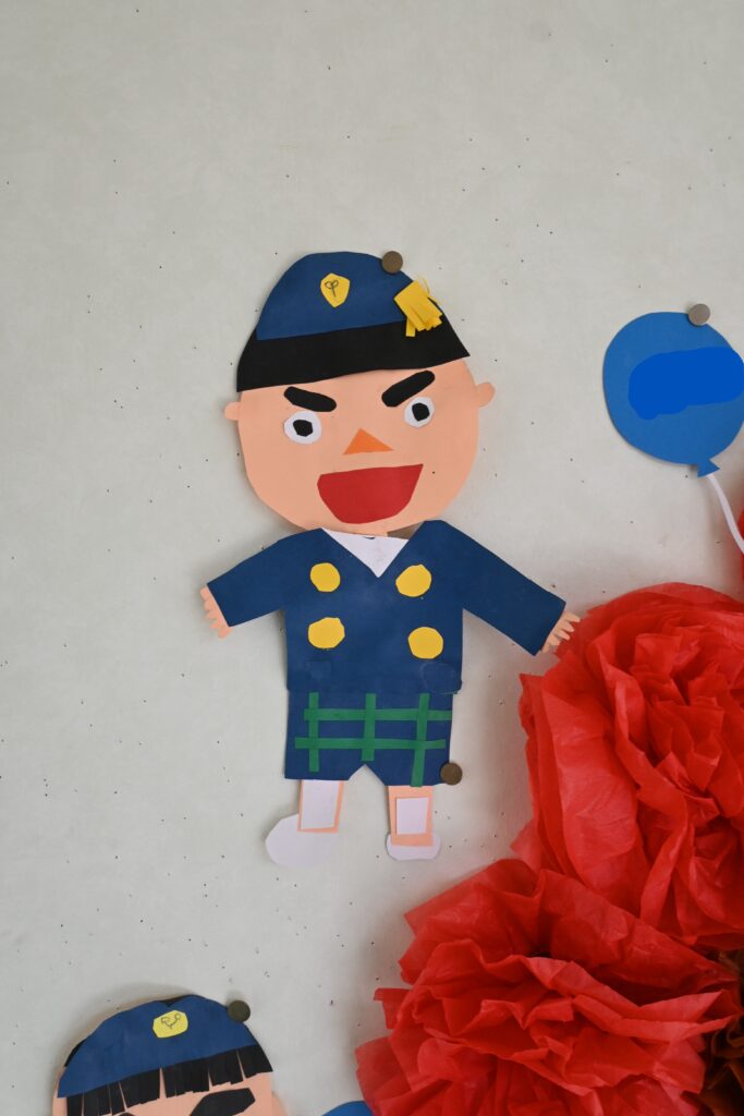 幼児教育祭で使用した飾りを大学から頂いたので、壁面に飾りました。もうすぐ卒園する年長児が幼稚園での思い出に『制服を着ている自分』を制作したので一緒に飾ることにしました。