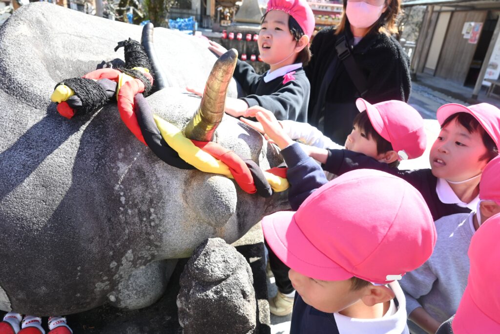 小学校で勉強を頑張れるよう、「勉強が楽しくできますように」と願いを込めながら牛を撫でました。