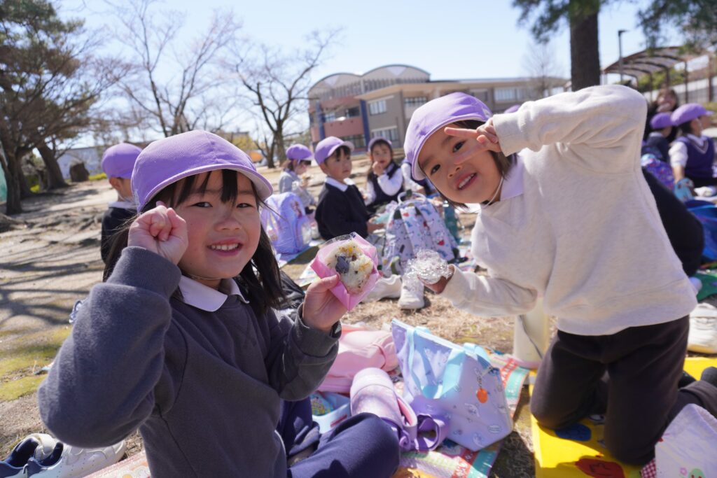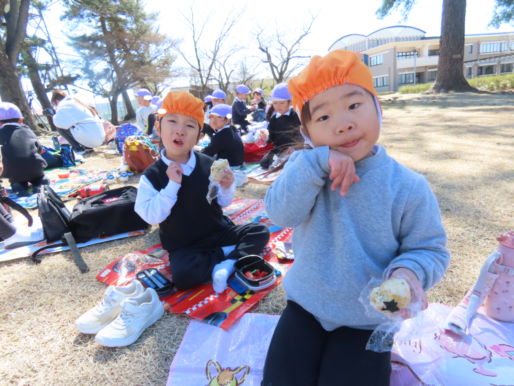 お昼ご飯は、おにぎりとデザート♡「おにぎり2こもあるんだよ!」「いちごが入ってる!」とお家の方が作ってくれたお弁当を見て嬉しそうな子ども達♪とっても美味しかったね♡