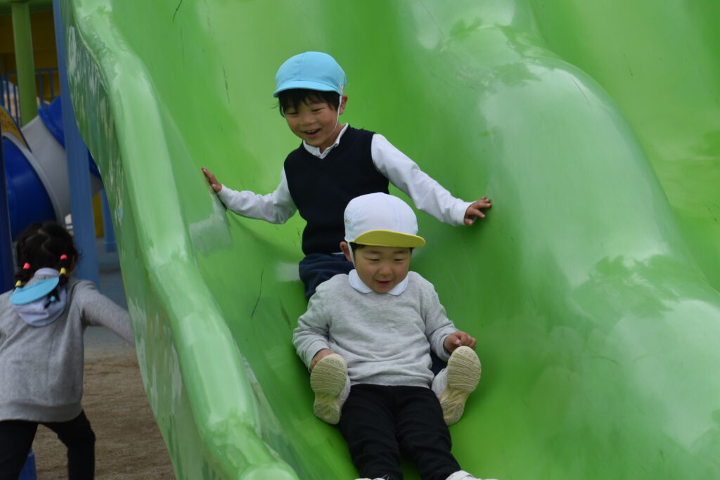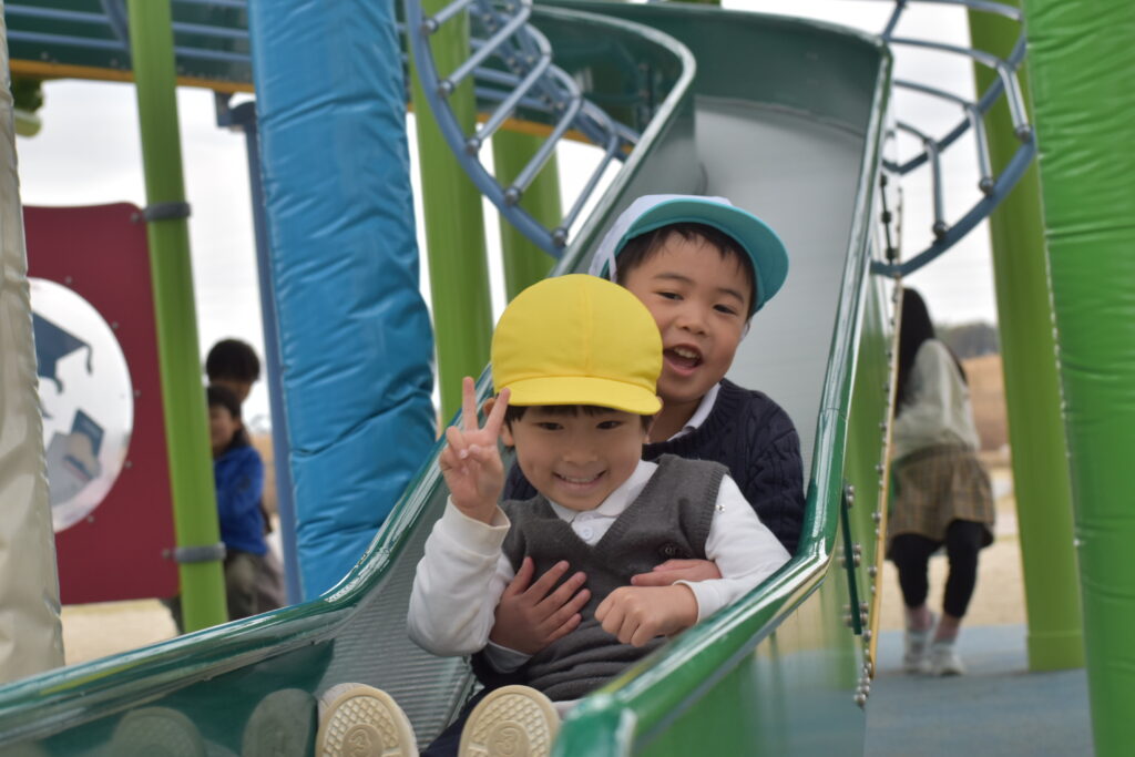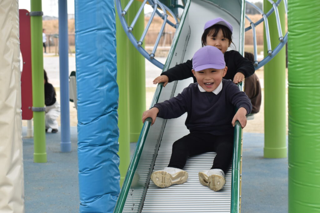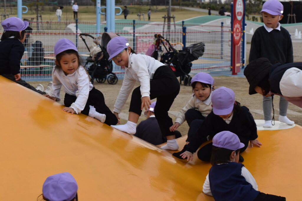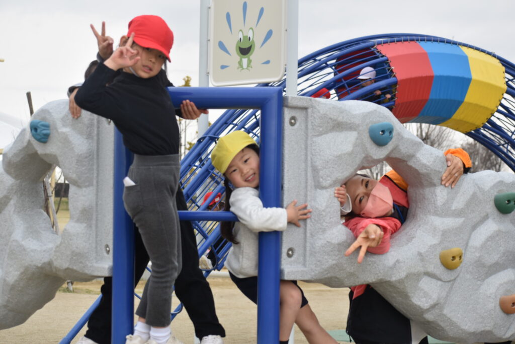 雨が心配でしたが午前中は雨も降らず、思い切り遊ぶことができました。大きな遊具から色々な滑り台が何本も出ていて、友達と一緒に何回も滑って楽しみました。他にもツルツル山を登ったり、ロッククライミングもして楽しみました♪