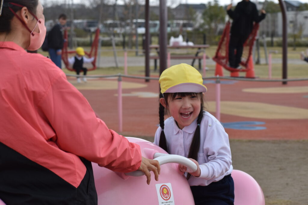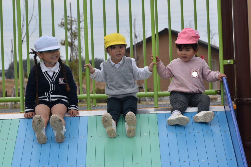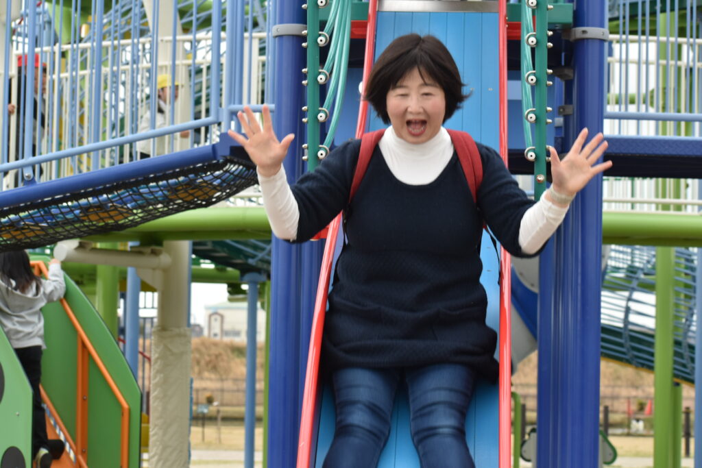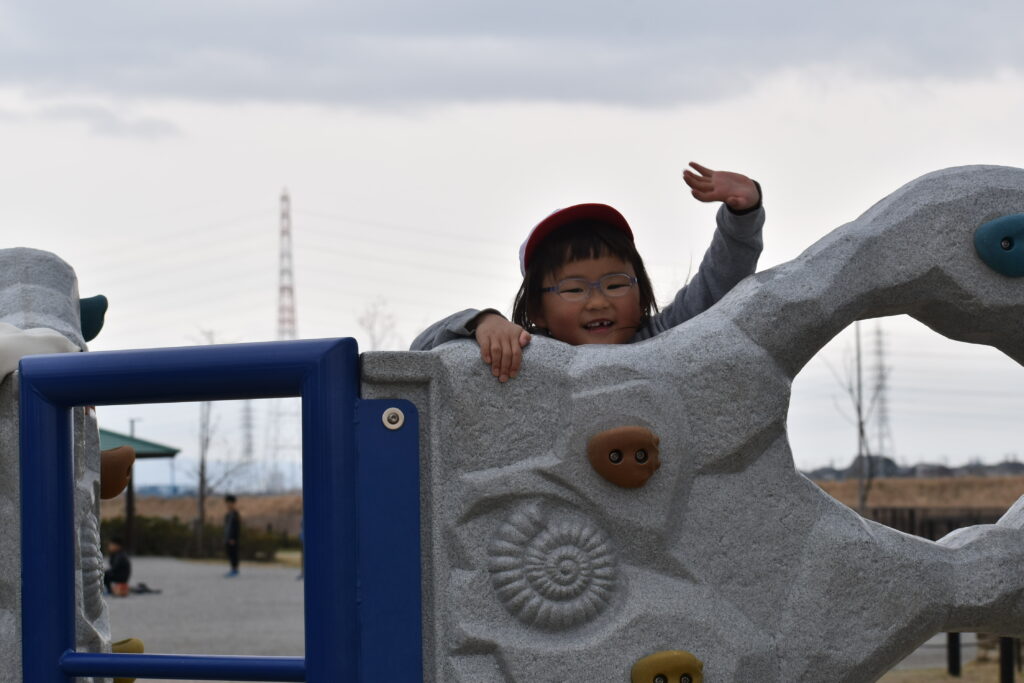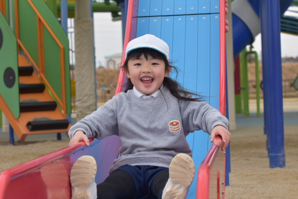 雨が心配でしたが午前中は雨も降らず、思い切り遊ぶことができました。大きな遊具から色々な滑り台が何本も出ていて、友達と一緒に何回も滑って楽しみました。他にもツルツル山を登ったり、ロッククライミングもして楽しみました♪