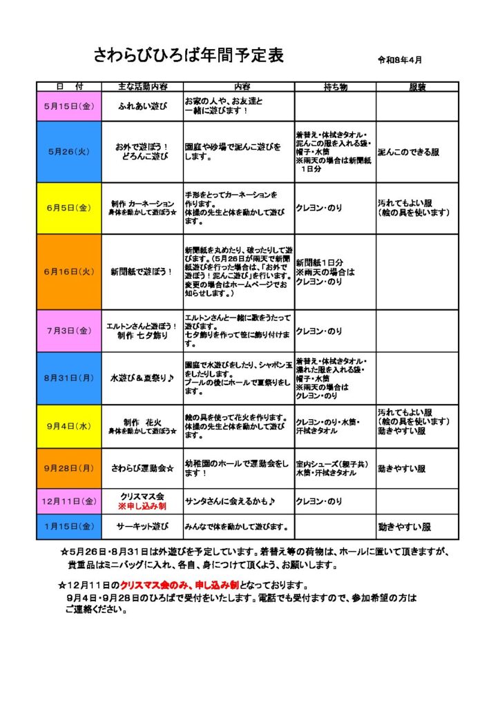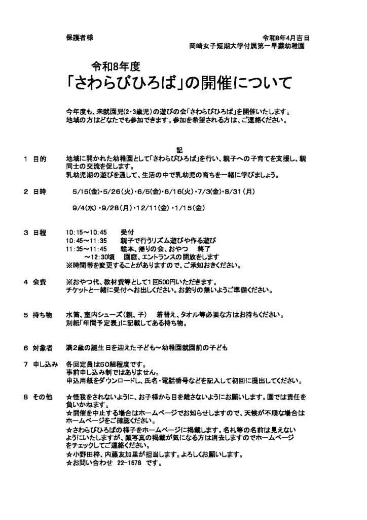 今年度もさわらび広場が始まります!!2歳になったお友達はぜひ遊びにきてください♪