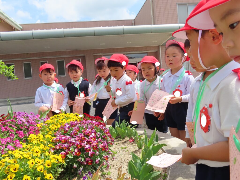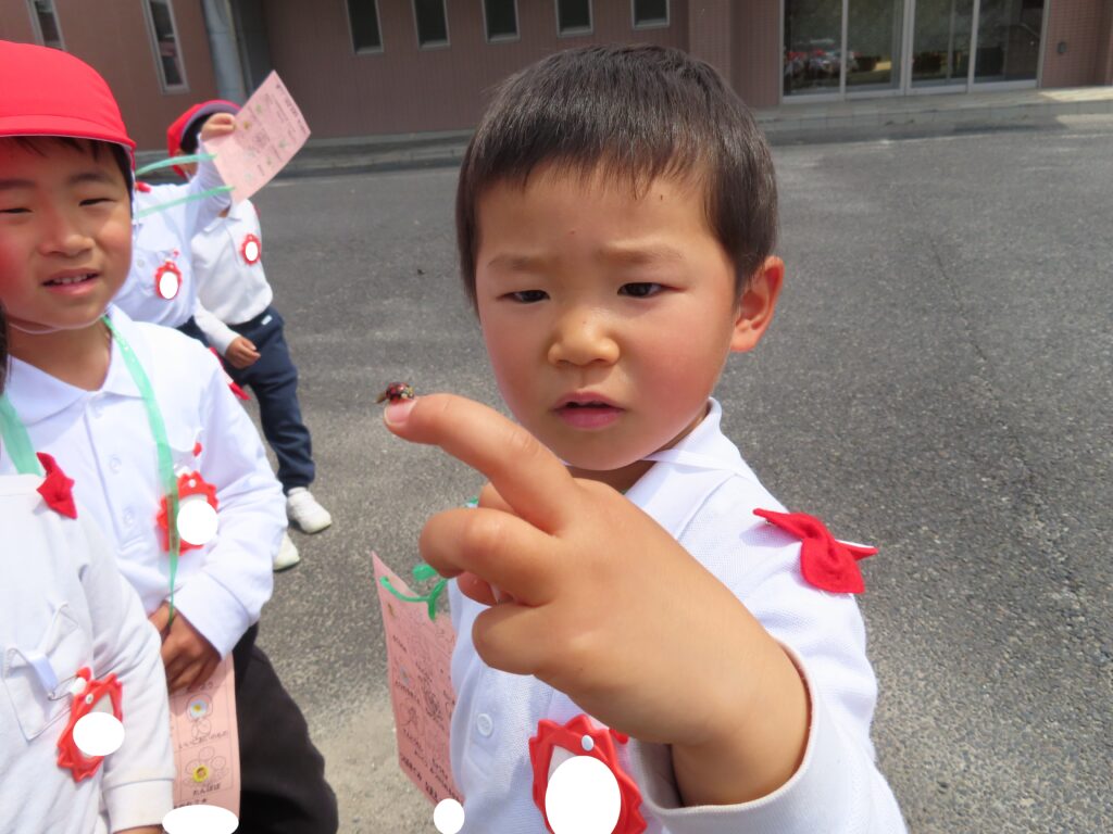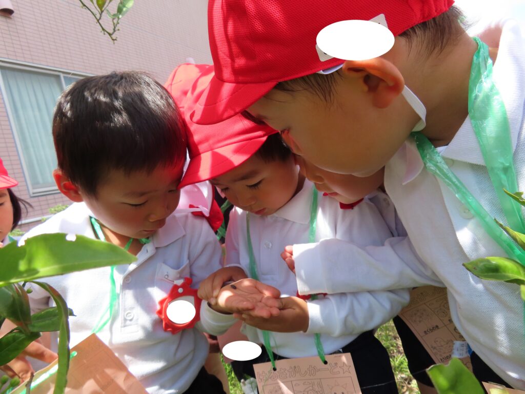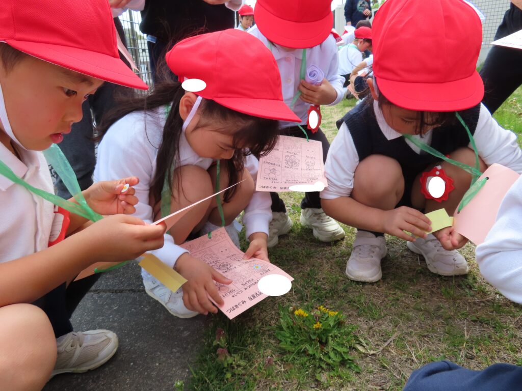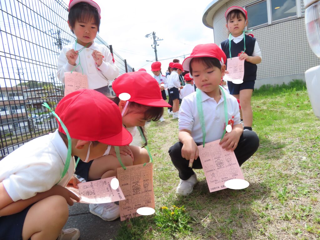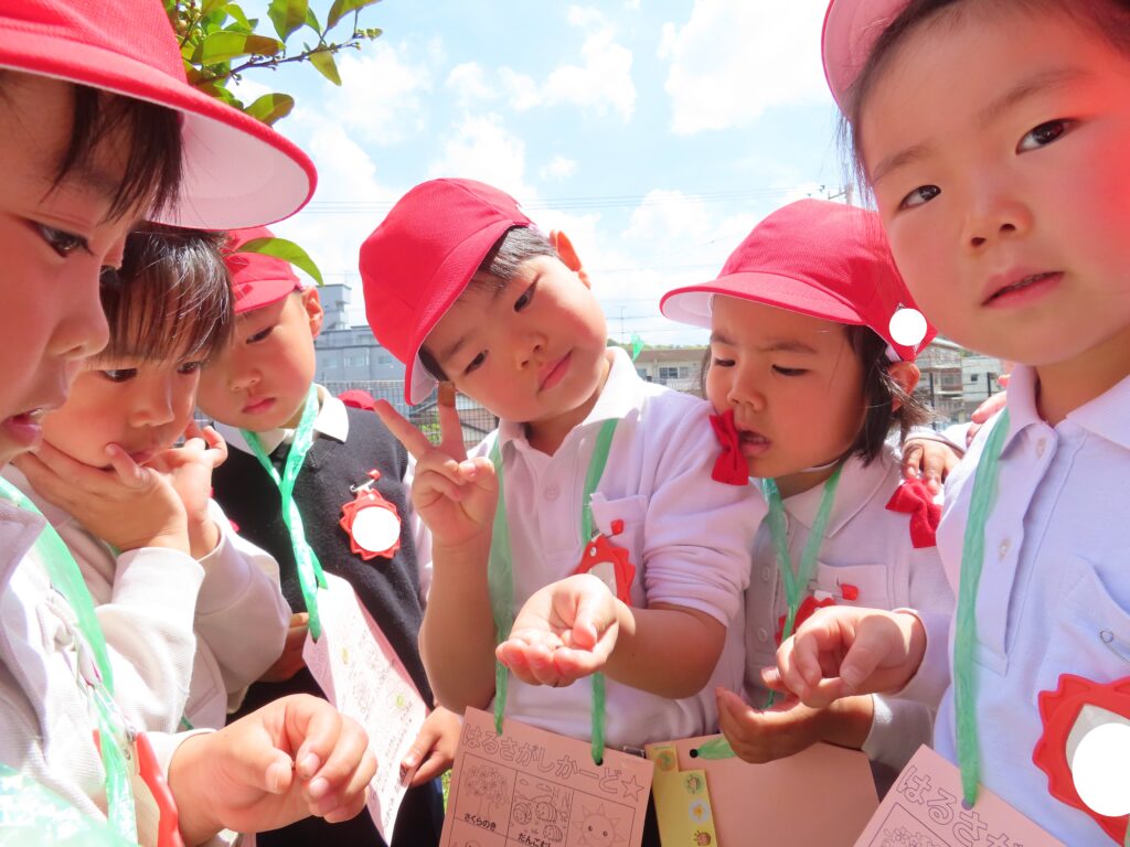 ぽかぽかと暖かい日が続いていますね!つばき組では裏庭へ出掛けて、春探しをしました!自分で作った春探しカードを持って出発!!「どこにいるのかなあ?」「見つけた!!」「しー!鳥の声が聞こえるかも!」「いい匂いだね!」など、五感を使って春探しを楽しみました!