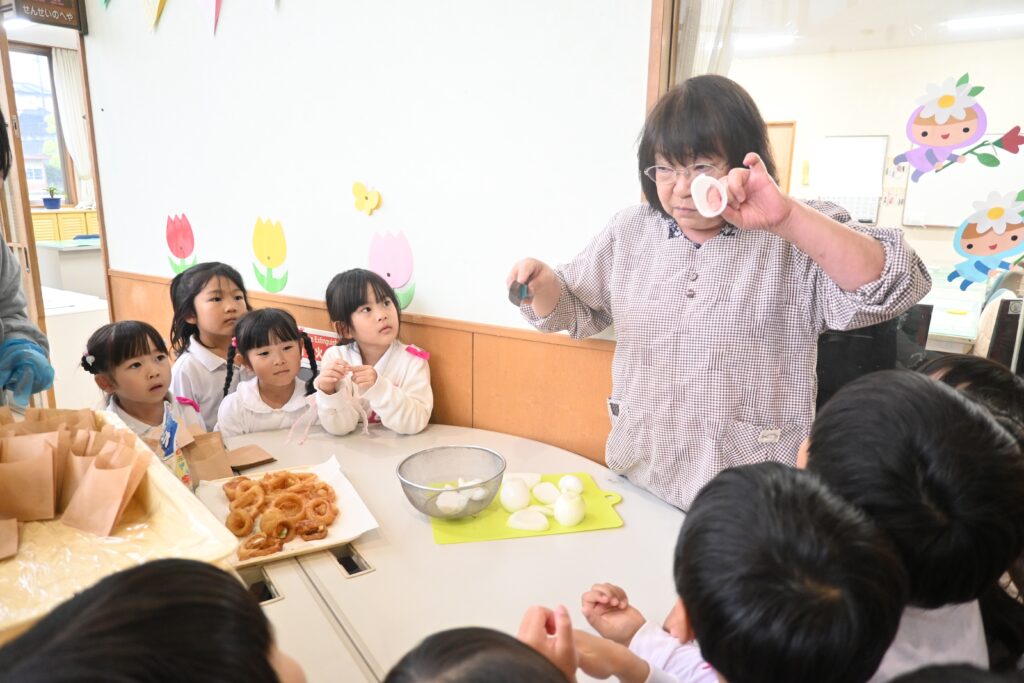 「なぜ、オニオンリングっていうのかな?」「玉ねぎをどうやって切るとリングになるのかな」という問題に見事に正解の年長組の子どもたち。旬の野菜をみんなで美味しく楽しく食べることが食育につながると思います。これからも、美味しい体験をたくさんしていこうと思います。