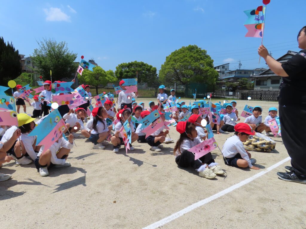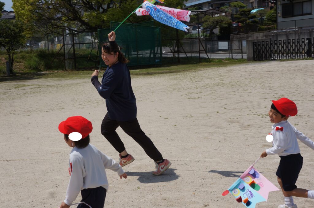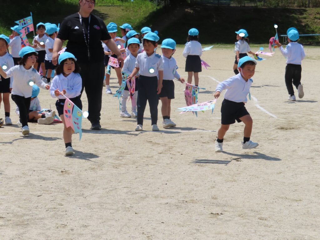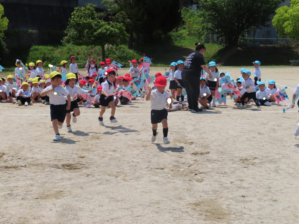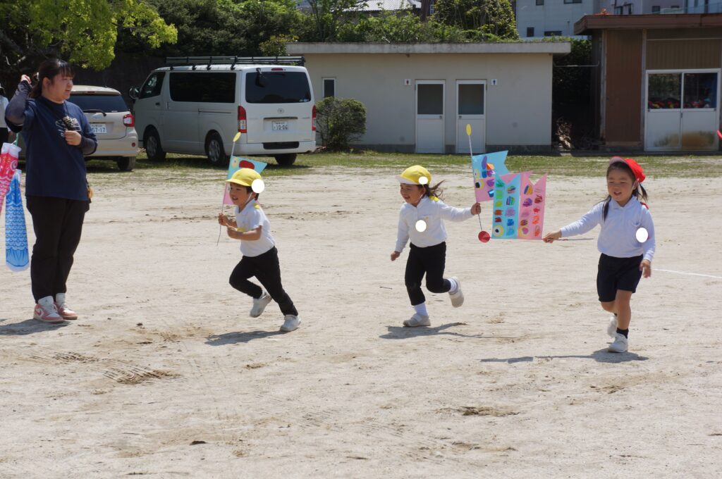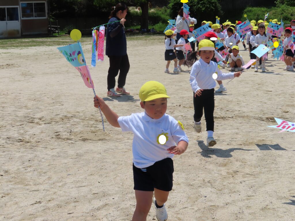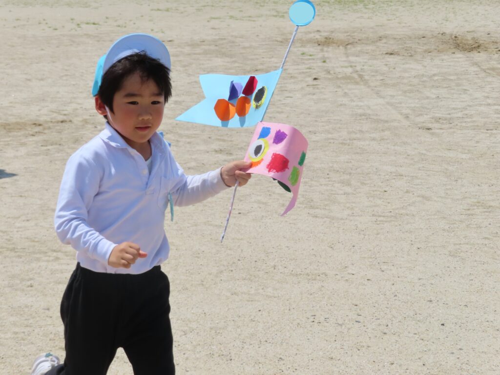 また、今日はとてもいい天気だったので、年中組みんなでこいのぼりかけっこをしました!こいのぼりを泳がせながら走るのはとても楽しかったね!!最後には先生こいのぼりかけっこもしました!楽しかったね★また、お家で飾るのが楽しみだね♪