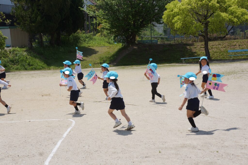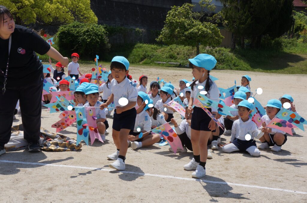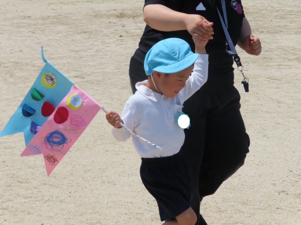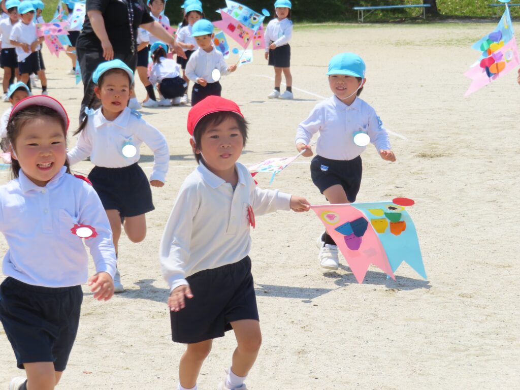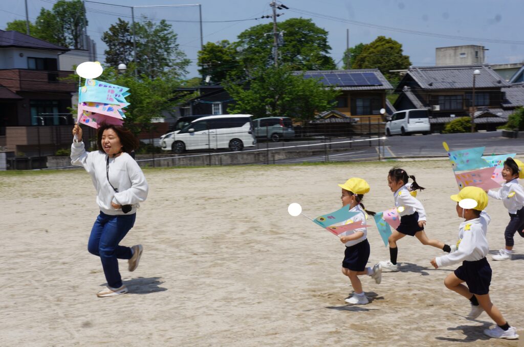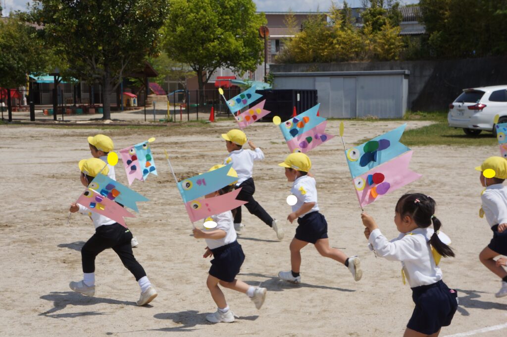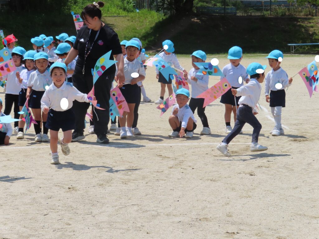 また、今日はとてもいい天気だったので、年中組みんなでこいのぼりかけっこをしました!こいのぼりを泳がせながら走るのはとても楽しかったね!!最後には先生こいのぼりかけっこもしました!楽しかったね★また、お家で飾るのが楽しみだね♪