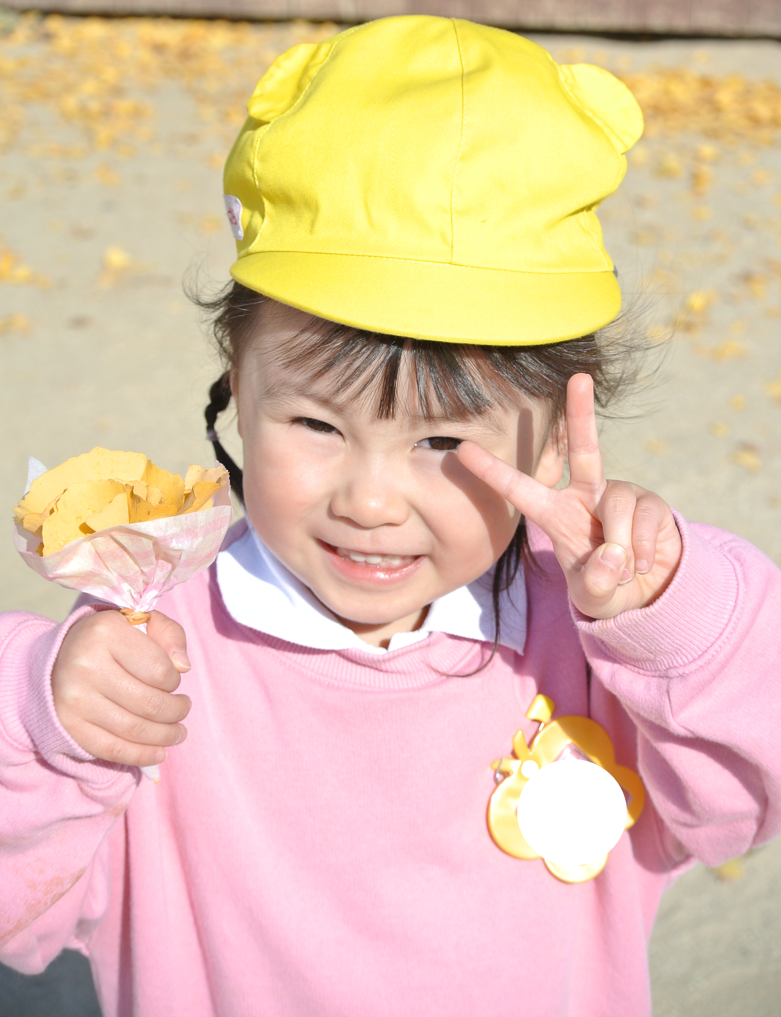 年中や年長のお姉さん、お兄さんたちがイチョウで素敵な花束を作っているのを見てひよこ組も挑戦! たくさん落ちているイチョウを一生懸命拾って花束のできあがり♪ 完成した花束を可愛くラッピングしてみました♡