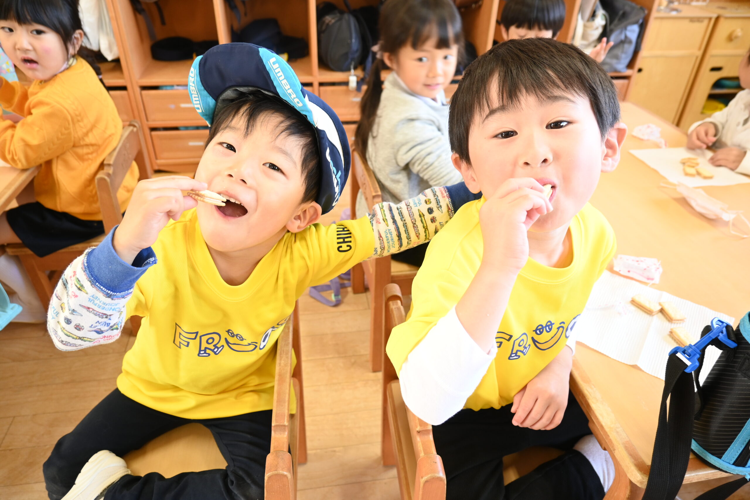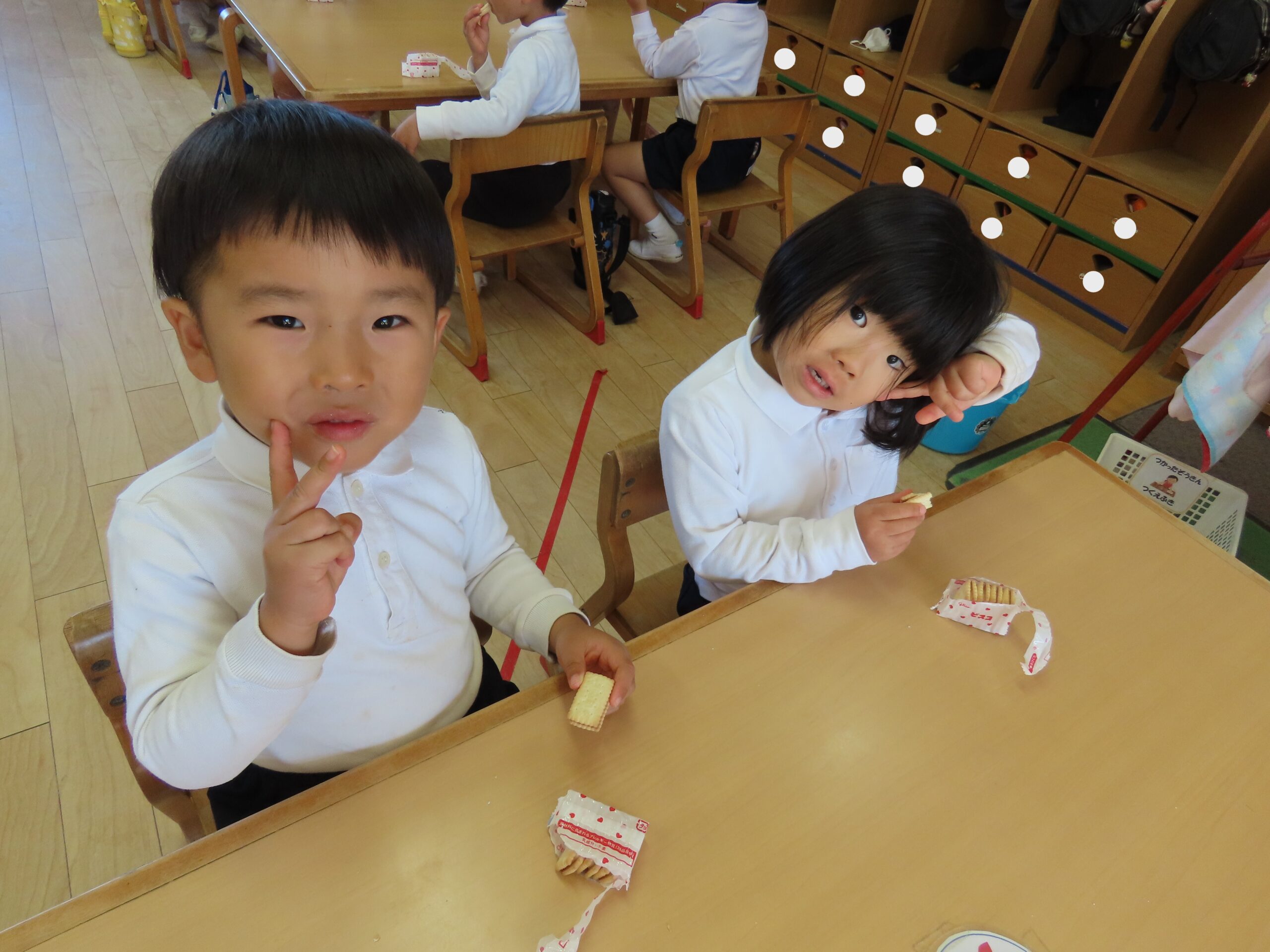 園庭で遊んでいると、職員室の先生が「おいもをどうぞ!」とふかし芋を持ってきてくれました。11月の初めに幼稚園で収穫したさつま芋で、てんぷら屋さんをした時に、少し残しておいたお芋です。 早速、たんぽぽ組におすそ分け。たんぽ […]
