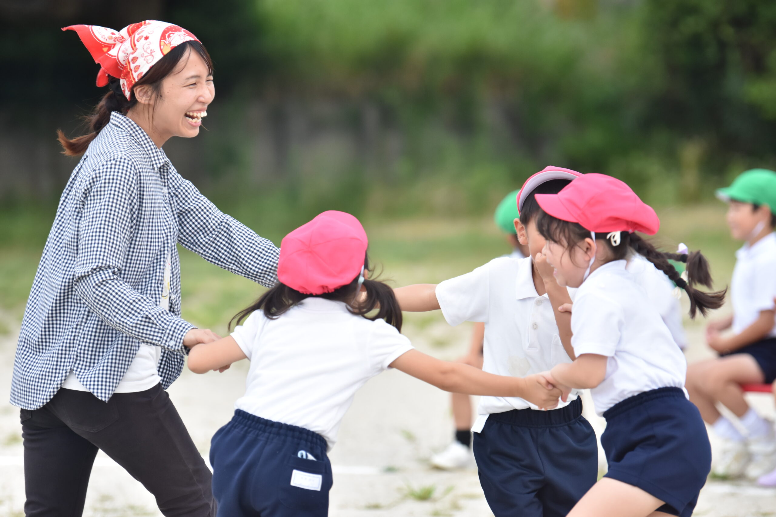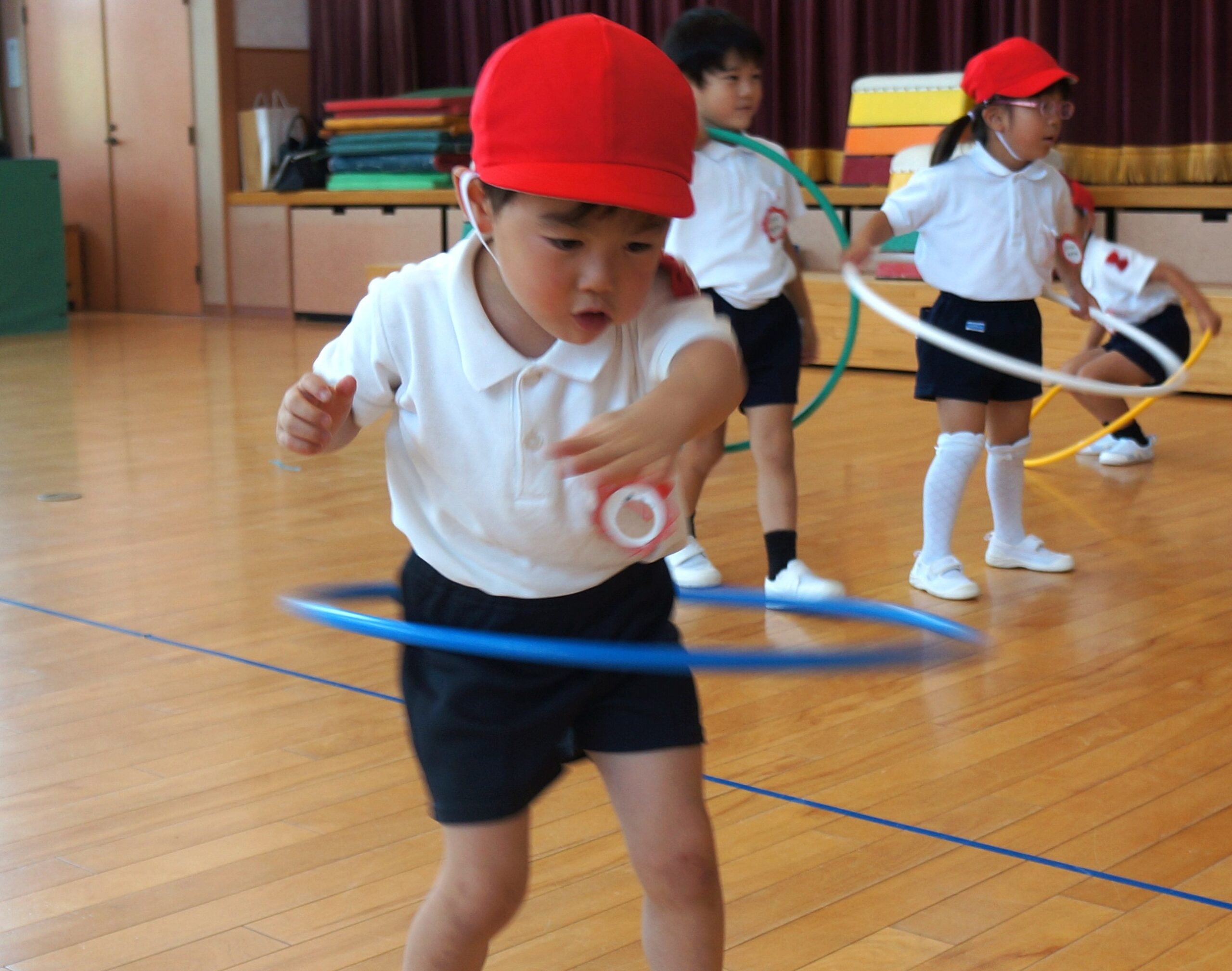講師の辻先生や加藤先生と一緒に元気に身体を動かして心地よさや楽しさを味わう「からだを動かして遊ぼう!」の時間です。元気いっぱい、大はしゃぎで、全身を使って遊んでいます。 体も心も笑顔いっぱいの時間ですね。