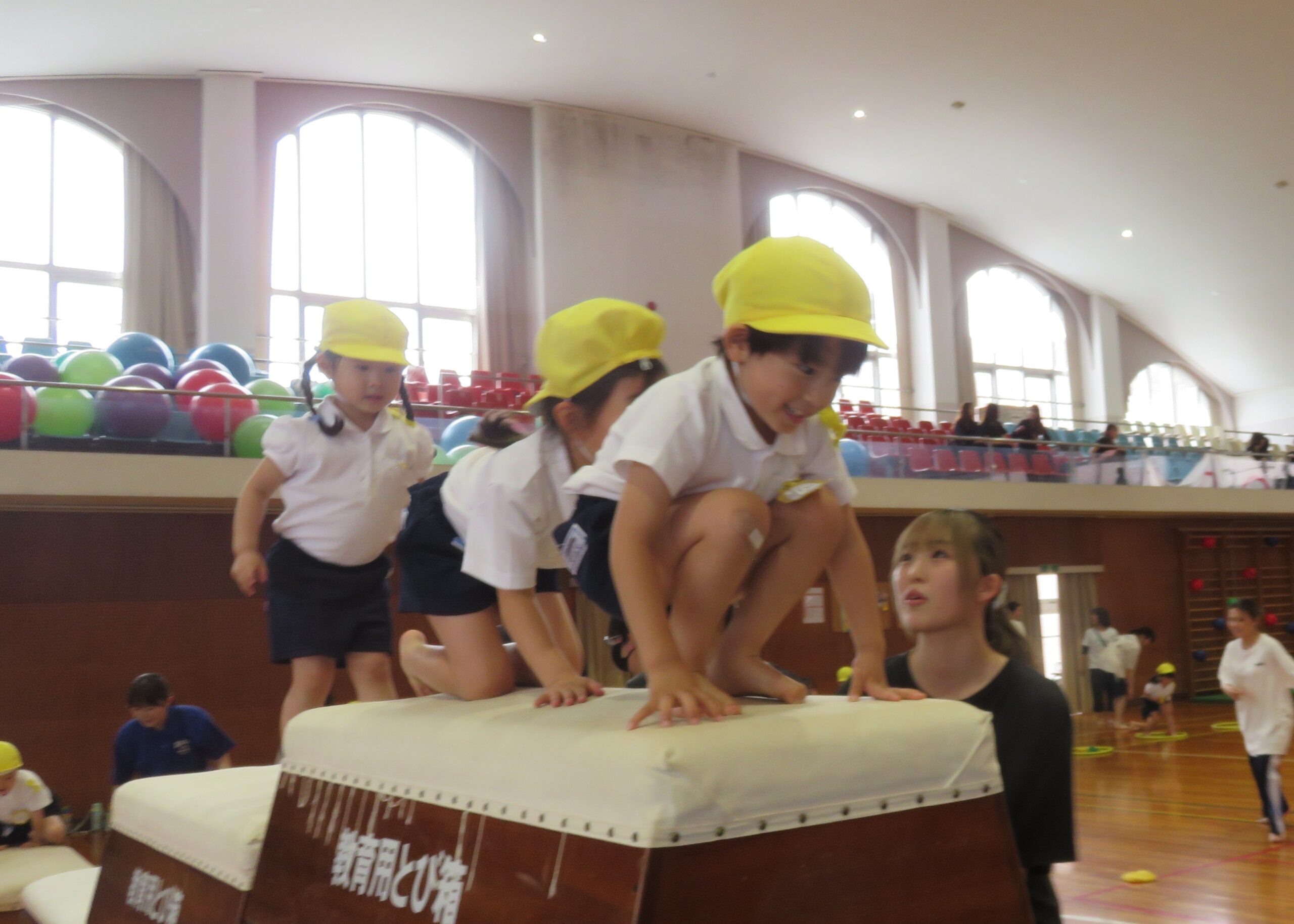 大学の体育館でさくら組とひまわり組の運動遊びがありました。大学の学生さんと一緒に跳び箱やトランポリンに挑戦しました。 勇気を出して「えい!」 体も心も大満足の運動遊びです。