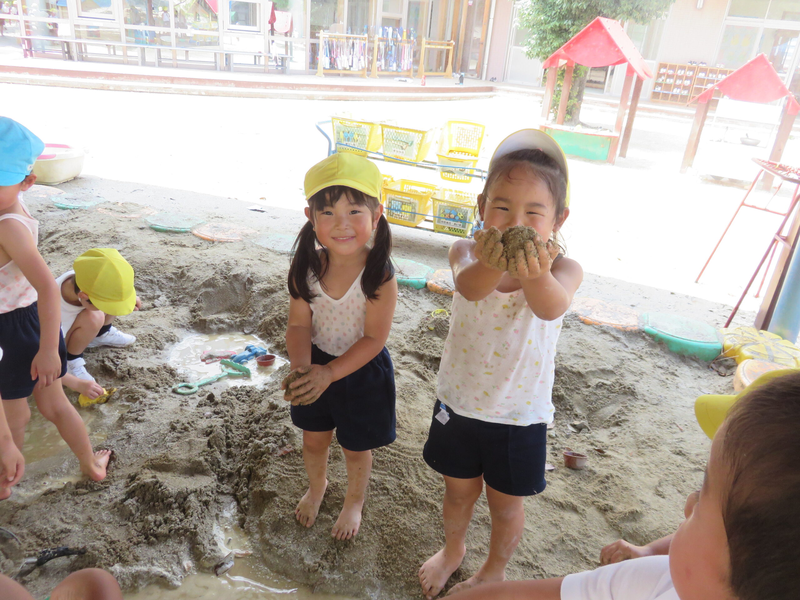 日陰で泥んこ遊びをしました。バケツで水を運んで川を作ったり、作った川の中に入って水の気持ちよさを感じたりしました。「こっちをもっと掘って川をつなげよう!」「僕が深くするから、どんどん水を持って来て!」みんなで相談しなが […]