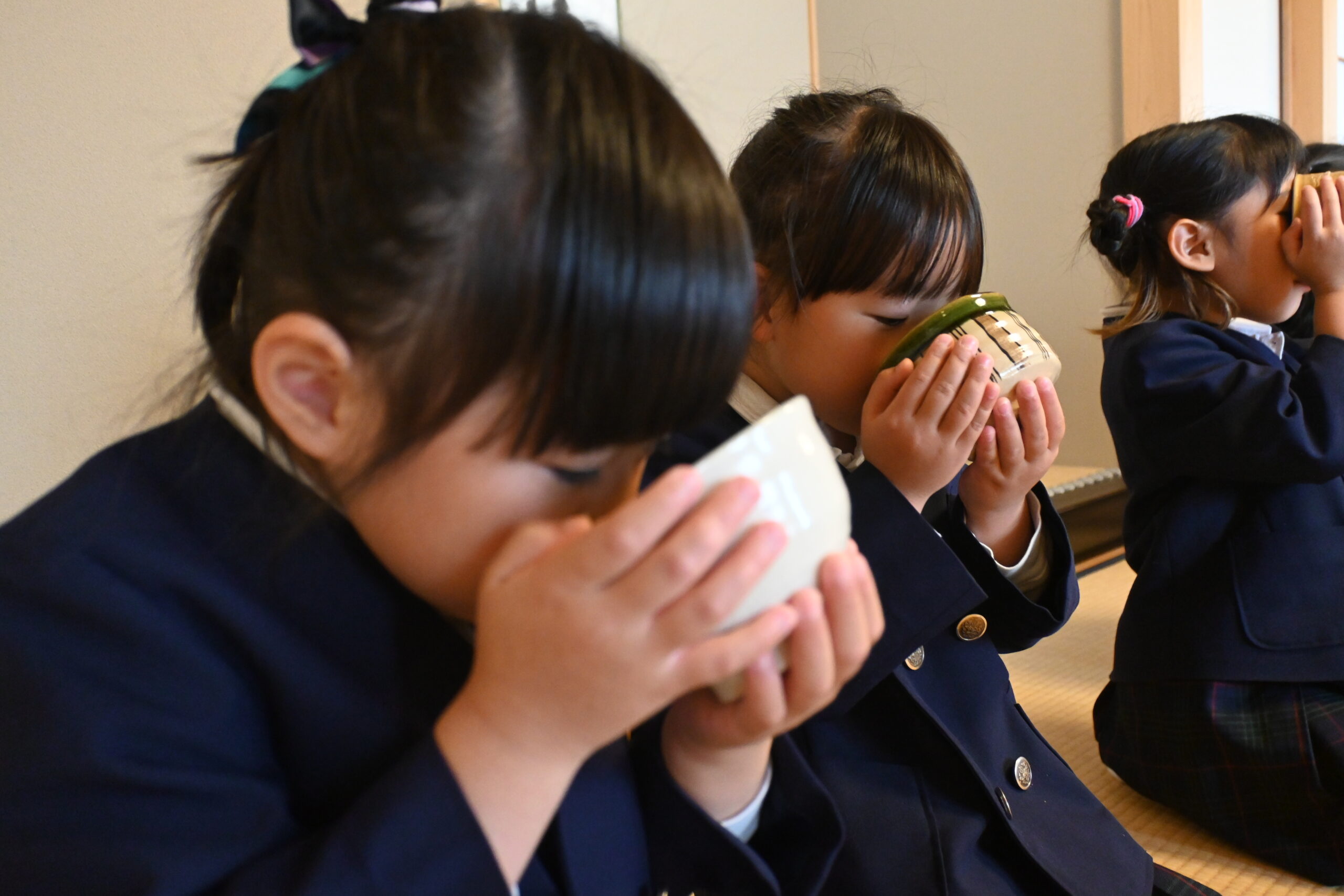 初めて入る茶室に少し緊張しながら茶道が始まりました。茶道のおもてなしのお話を聞いたり、季節の花を眺めたりしました。初めて食べるお茶菓子に「おいしい」と笑顔もこぼれました。少しずつ茶道の心を感じていけたらと思います。