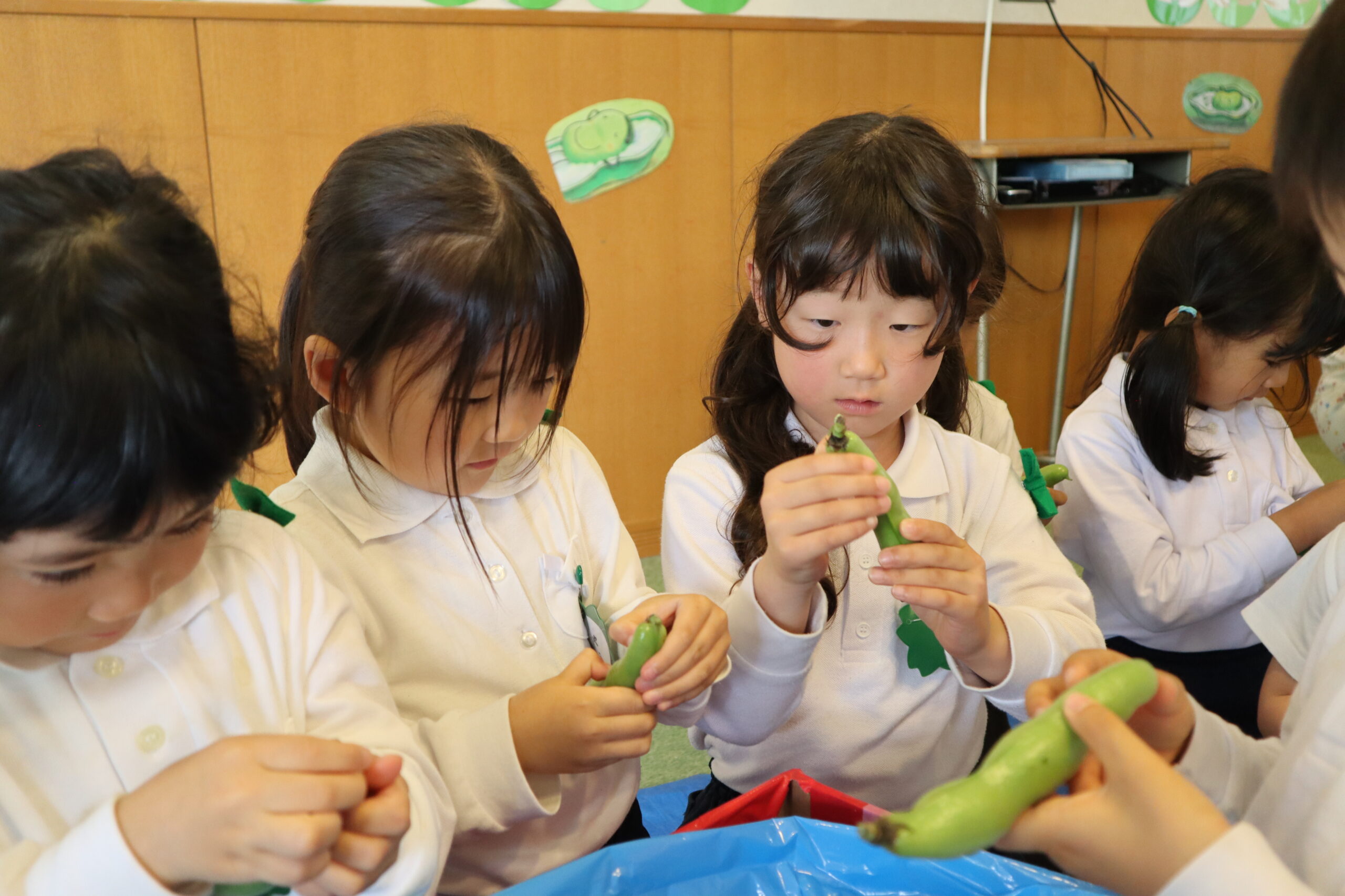 野菜博士の浅井先生が、畑で収穫した大きなそら豆をたくさん幼稚園の子どもたちの為に持ってきてくれました♪ ホールを暗くしていつもとは違う特別な雰囲気で『そらまめくんのベッド』の絵本を見た後に、自分でそら豆をむいてみました! […]