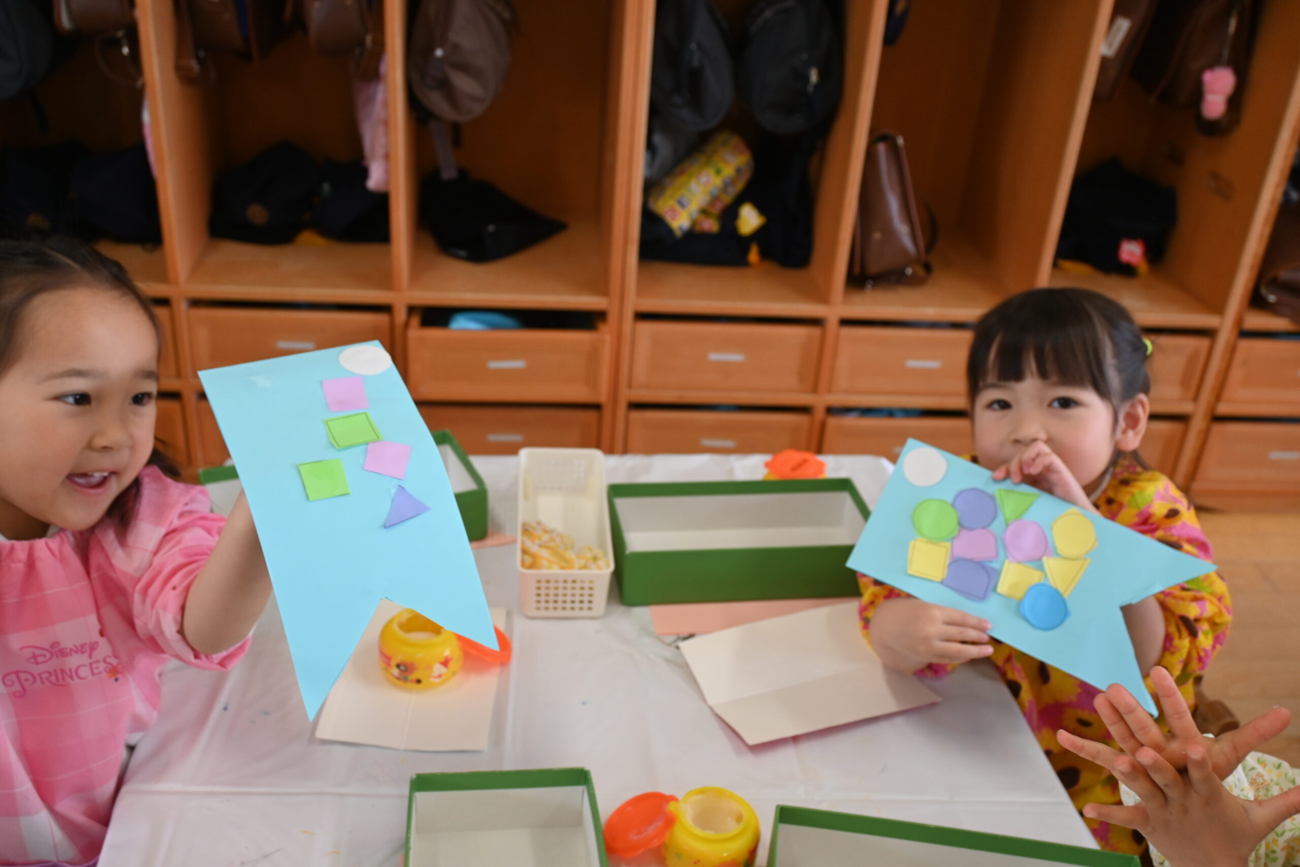 お父さんこいのぼりには、好きな色の好きな形を選んで、ハサミで切って飾りました。画用紙の線をじっと見ながら真剣に切ることを楽しみました。 お母さんこいのぼりには、お花がみを丸めたり、ねじったりして飾りました。 組み立ても […]