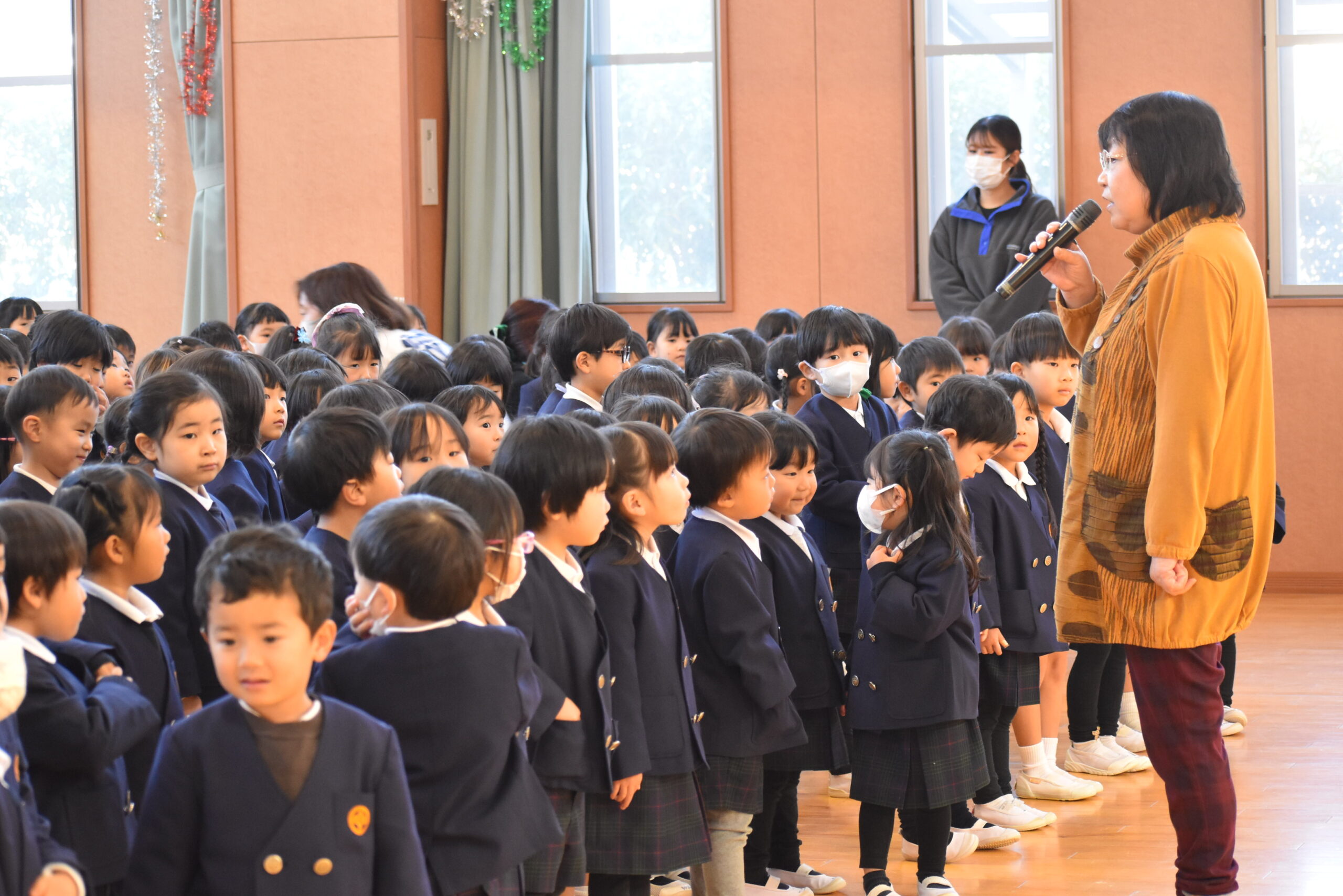 遊戯ホールで2学期の終業式をしました。 園長先生から冬休みの過ごし方や、年末の挨拶や、新年の挨拶を教えてもらいました。 みんなで歌も歌いました。 みんなに会えるのを楽しみにしています。 楽しい年末年始をお過ごしください!
