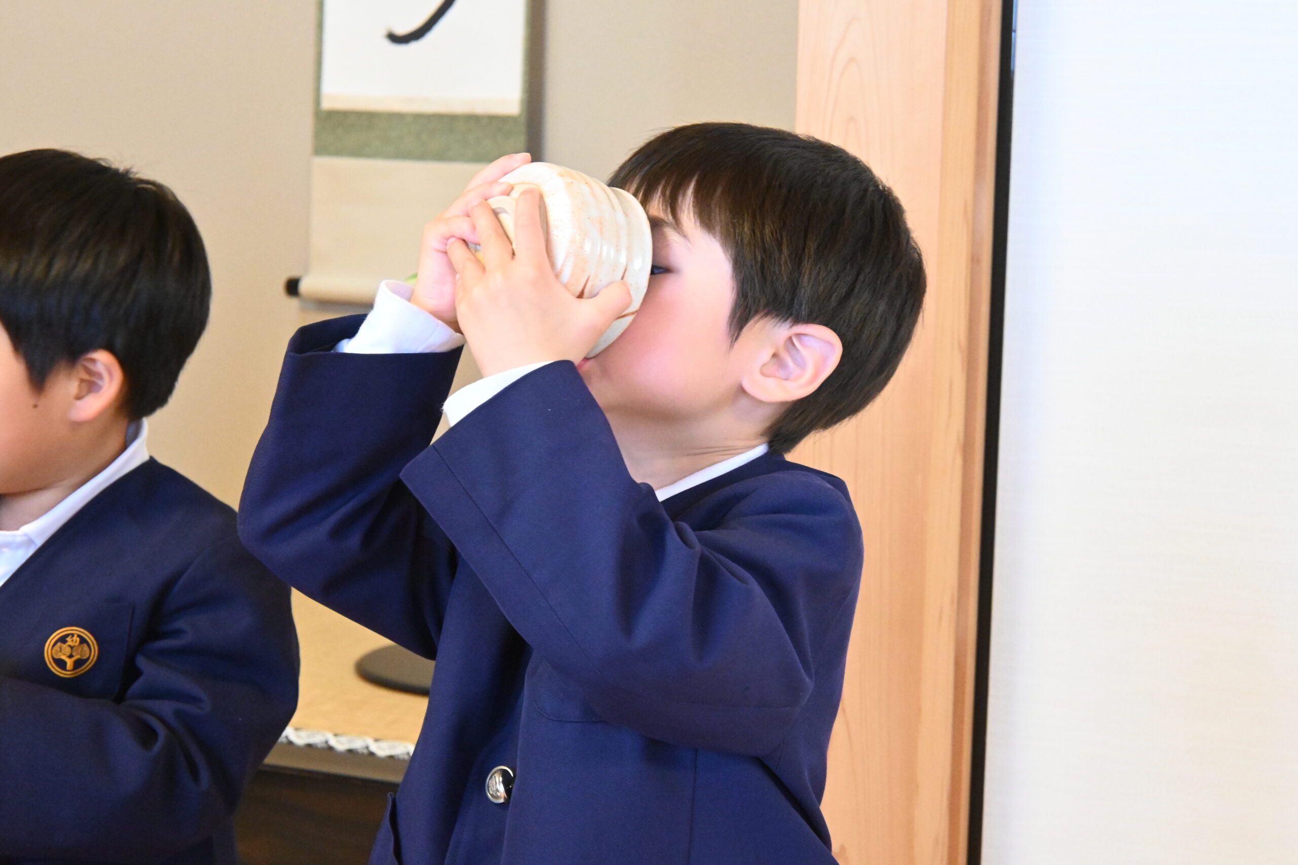 初めて茶室に入って初めての茶道をしました。少し緊張していたようですが、お茶菓子を口にすると笑顔が見られました。お辞儀の仕方や人への気づかいを学びました。次回も楽しみですね。