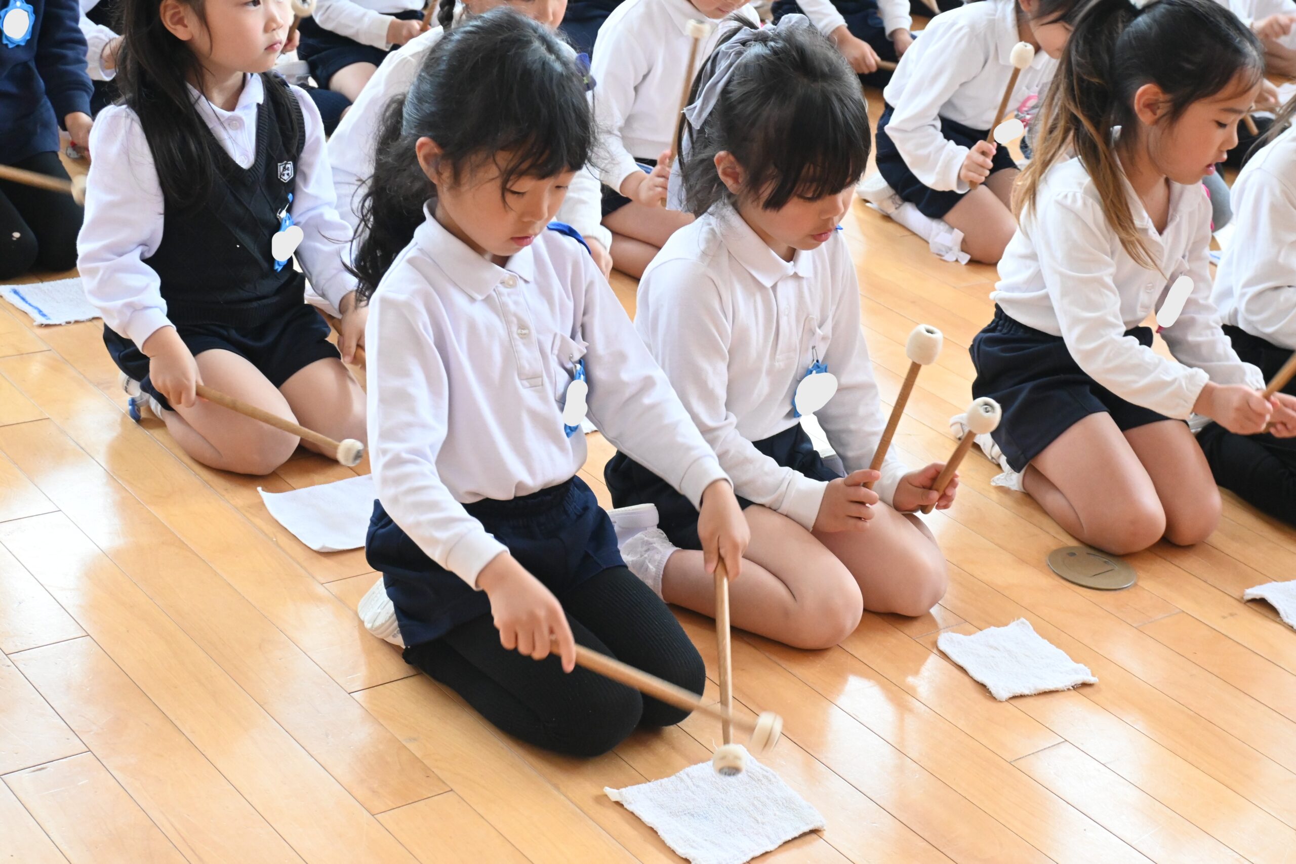 今日は年長組のみんなでバチ遊びをしました。 みんなでバチの持ち方の確認をしたり、息を合わせて雑巾を叩いたりと楽しむ姿が見られました♪ 本物の太鼓を叩いて演奏する時が楽しみだね♪