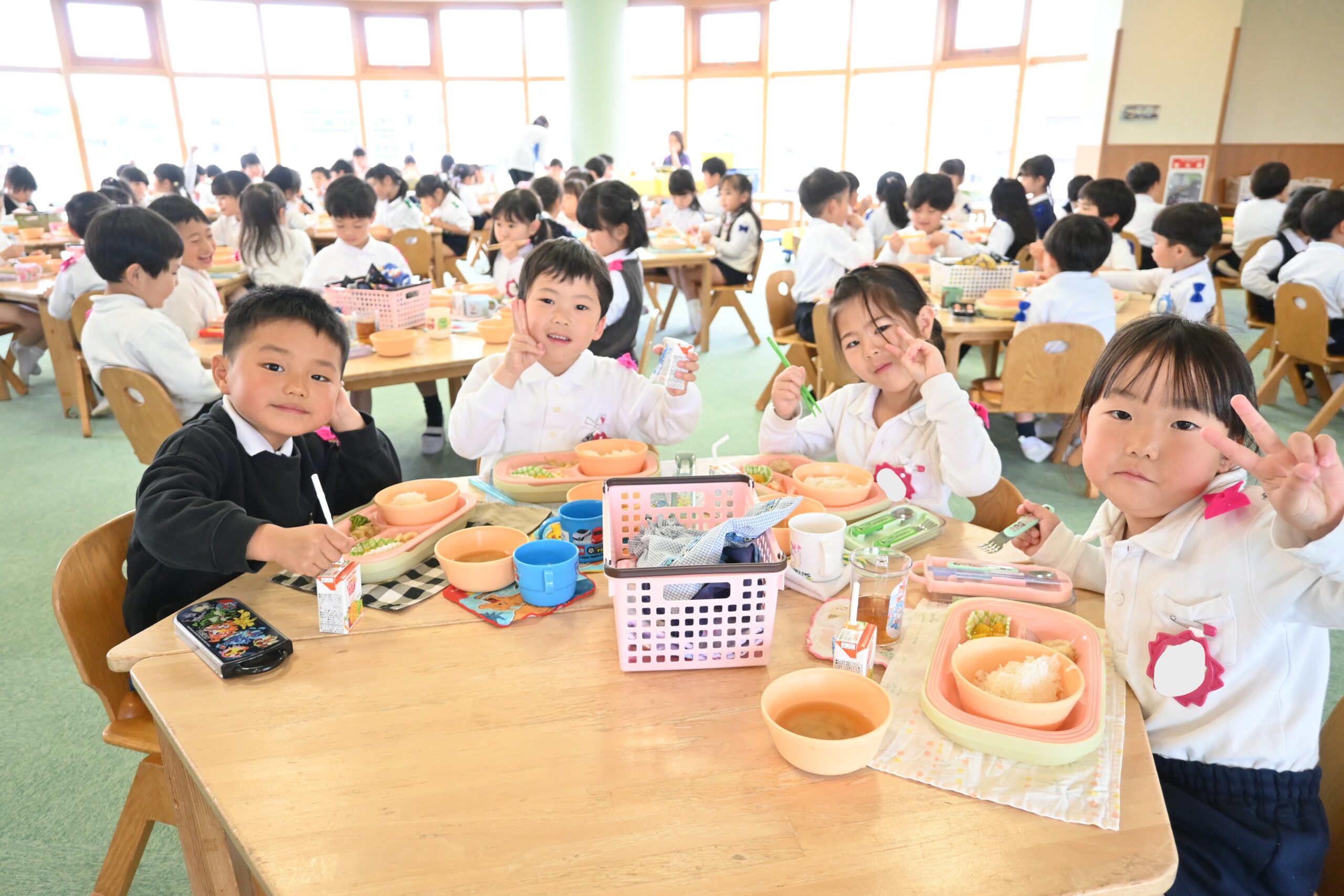 年長組のみんなでランチルームで給食を食べました! 広いスペースで仲良しの友達と話しながら食べ、とても嬉しそうなこどもたち! これから給食当番も始まるね!楽しいことがいっぱいで楽しみだね♪