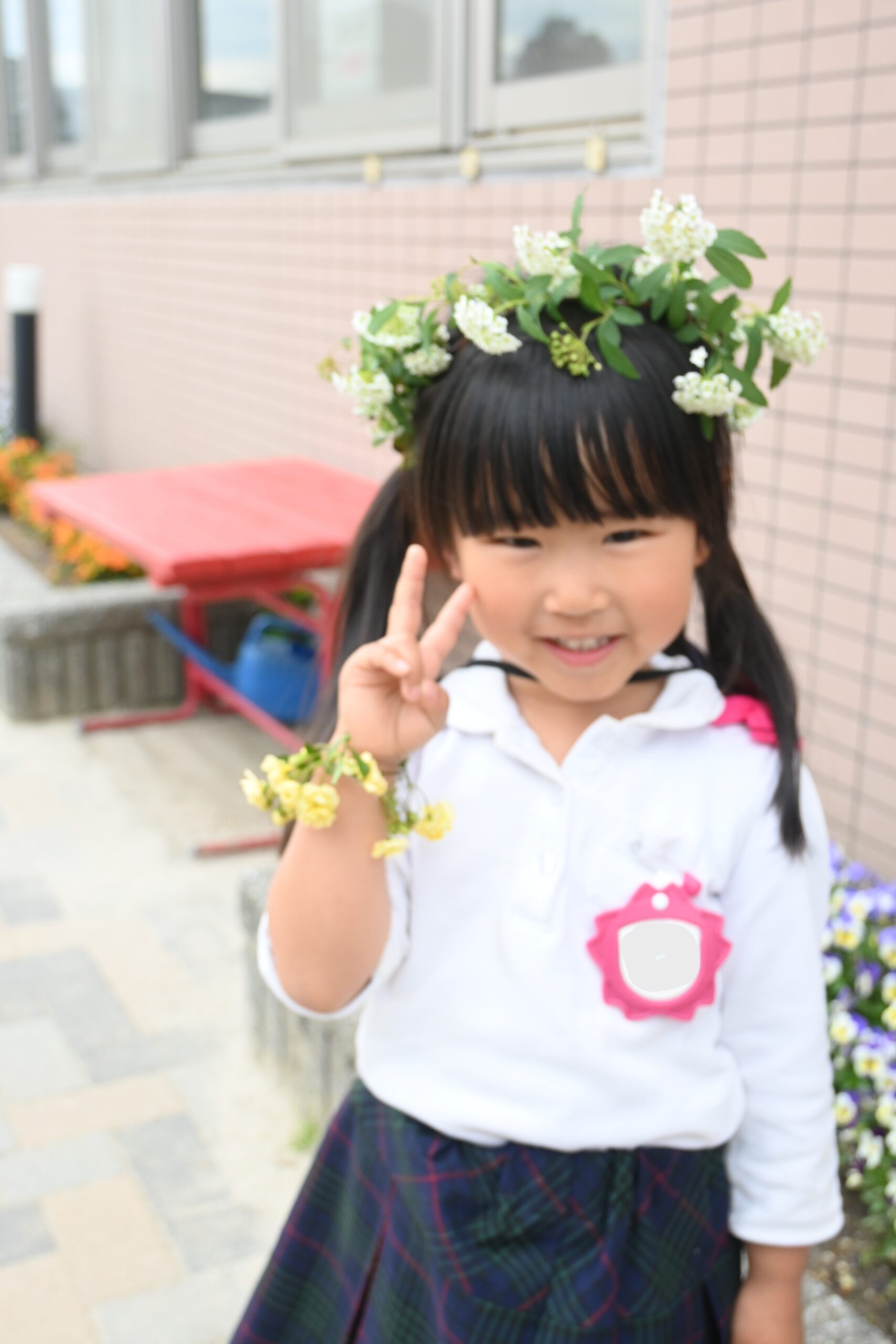 水野先生が自宅の庭に咲いていた花を使ってお花の冠を作りました。 「お姫様になったみたい♪」とポーズを決めていたり、花びらを観察したりしていました。 春だからこそ楽しめる遊びを思い切り楽しみました!