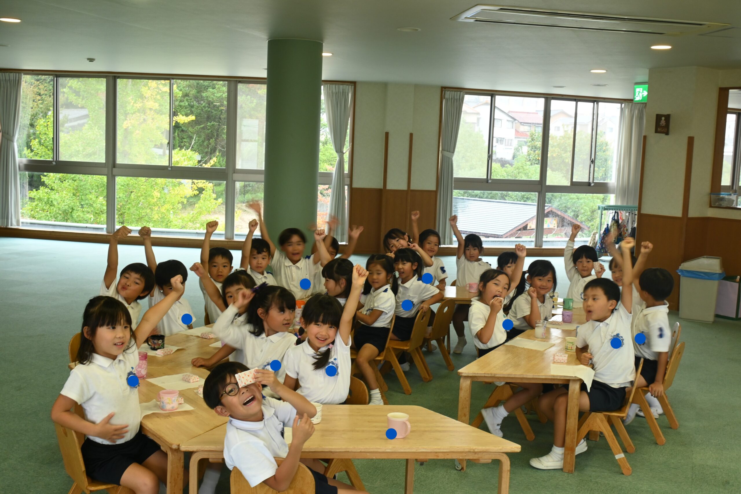 「運動会、元気いっぱい頑張るぞ!」ということで、みんなでカルピスで乾杯して、甘いビスコでパワーをためて・・・。 友だちと一緒に食べるビスコとカルピスにとてもいい笑顔の子どもたち。 運動会に向けて元気100倍だね。