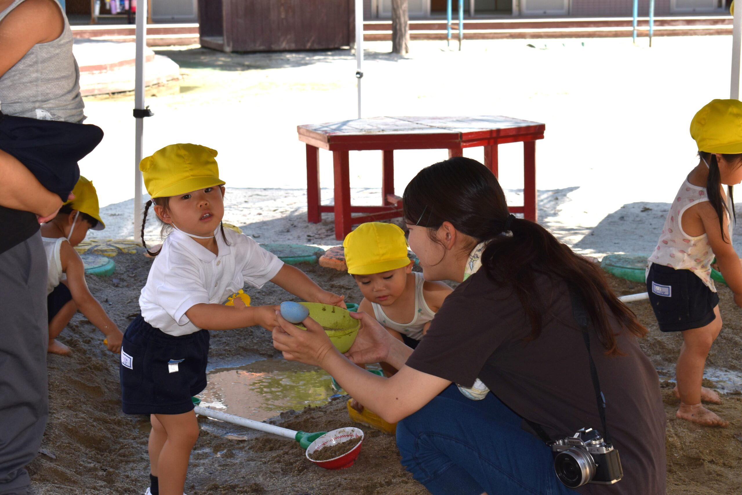 幼稚園のアイドル、満3歳児の子どもたち。天気の良い日は水遊びや涼しい砂場で遊んでいます。 顔に水がかかるのにも、泥んこにもすっかり慣れてご機嫌。「幼稚園楽しい!!」の毎日は最高です!