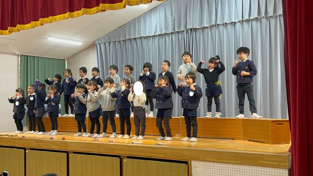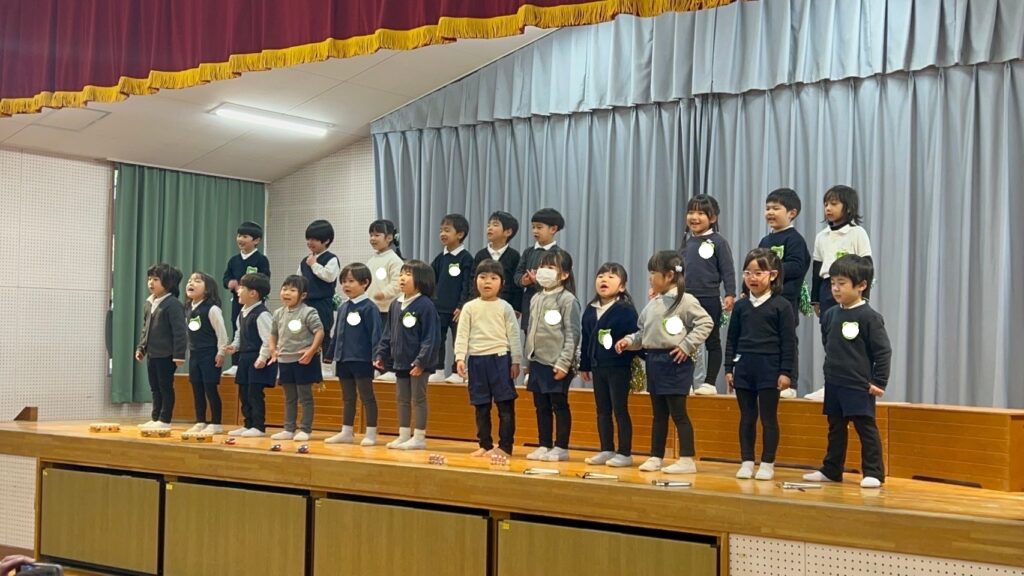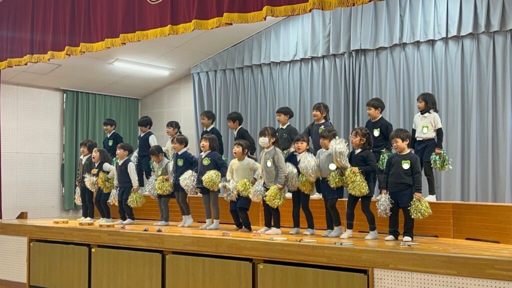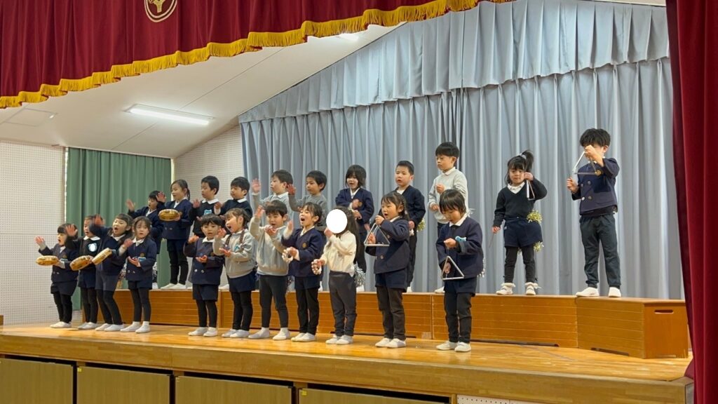 音楽発表では、楽器、歌、ダンスを行いました。少し緊張した様子の子もいましたが、2学期から楽しんできた楽器遊びや普段から歌っている歌や踊っているダンスを大好きなお家の人の前で、楽しんで発表することができました!