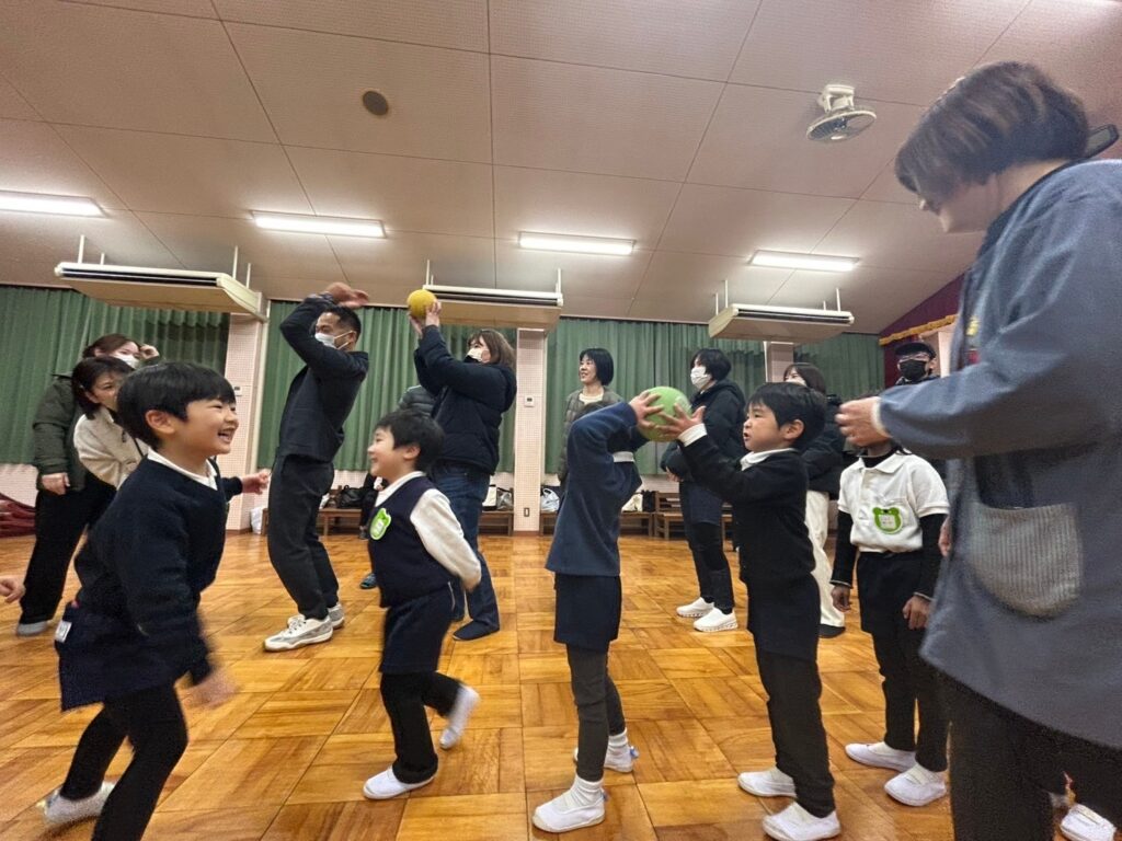 音楽発表の後は、じゃんけん列車とボール送りリレーでお家の人と一緒に遊びました。