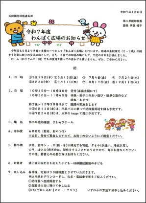 お待たせいたしました。今年度も5月より子育て支援の一つとして『わんぱく広場』を行います。地域の2~3歳の親子を対象に、親子の交流の場として、また子育て相談の場として、年8回を計画しました。ぜひご参加ください。