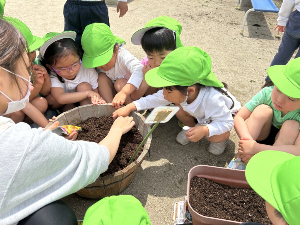 子どもたちは、「おおきくなってね!」「どれくらいでできるのかな?」と生長に期待しながら苗を植えたり、花の種をまいたりしていました。