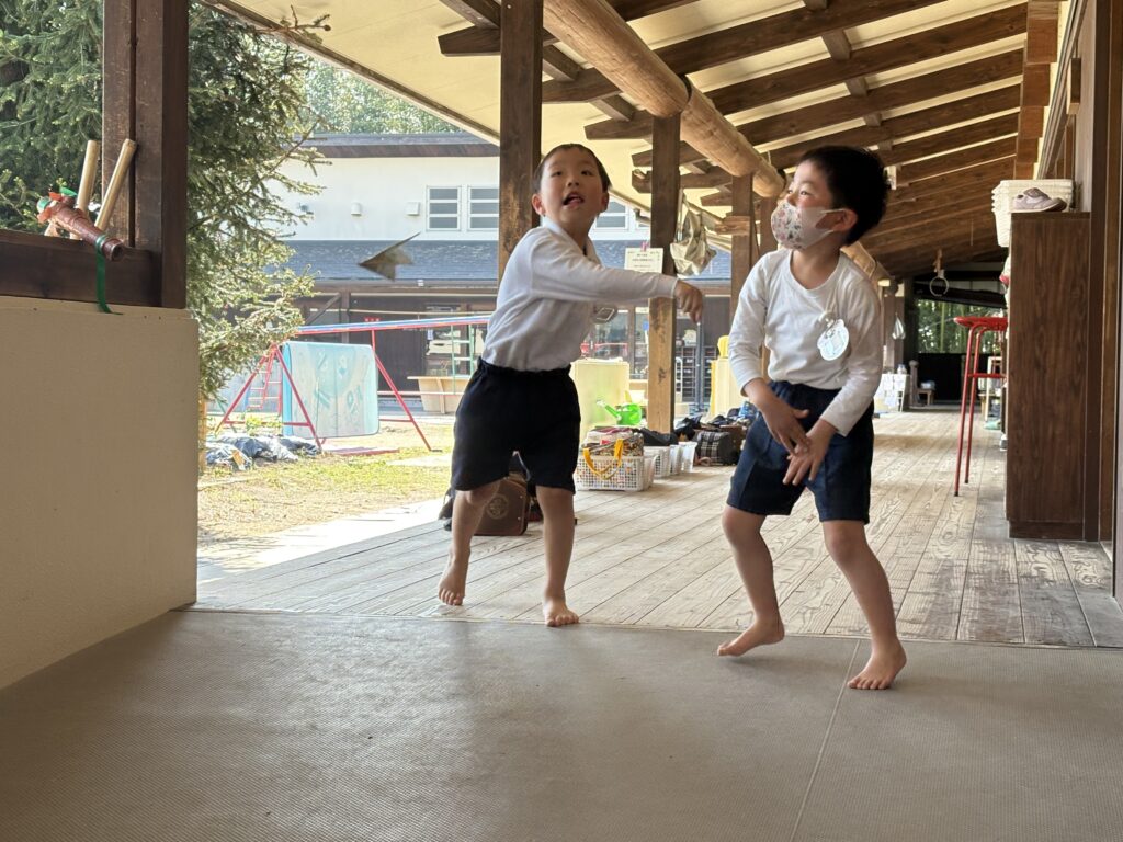 年中さんはひとつ大きくなって、年少さんの見本になろうと張り切って支度をしたり、年少さんを遊びに誘ったりしています。