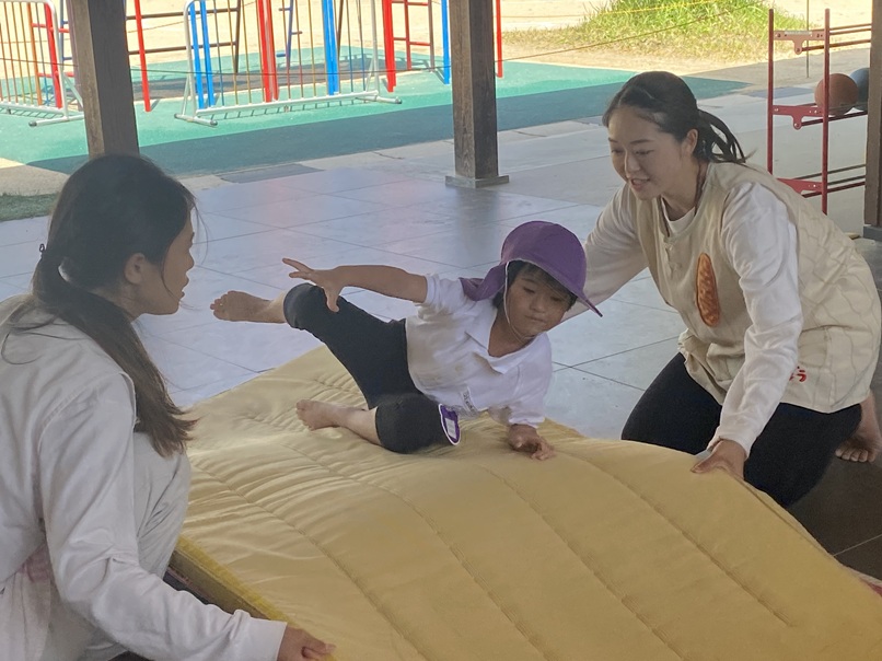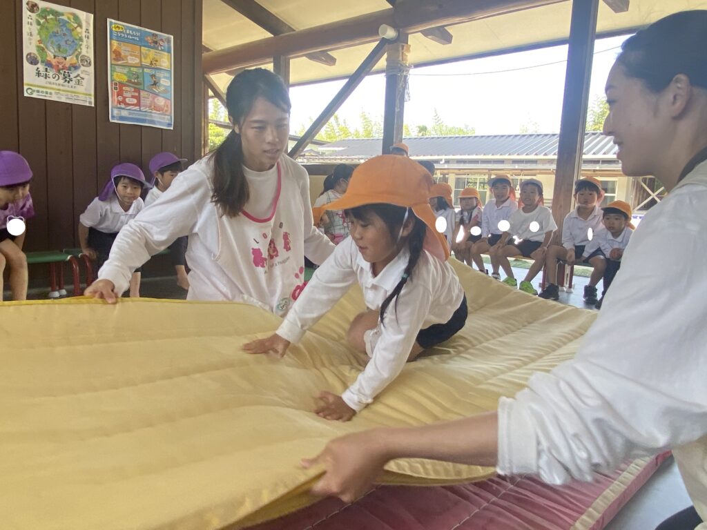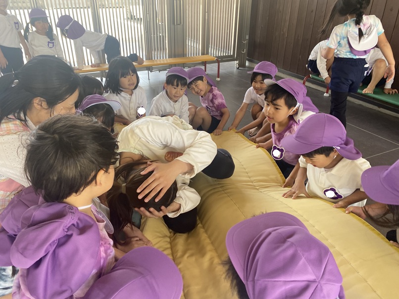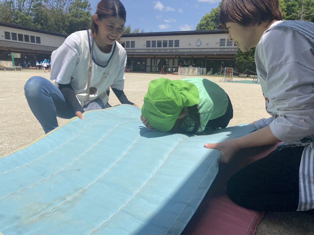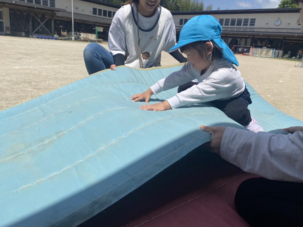 また、年中・年長の子どもたちは、「地震の揺れ」とはどんな風なのか、疑似体験を行いました。大きな地震の際は、身動きをとることが難しくなることを、身をもって感じていました。