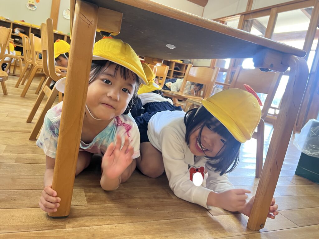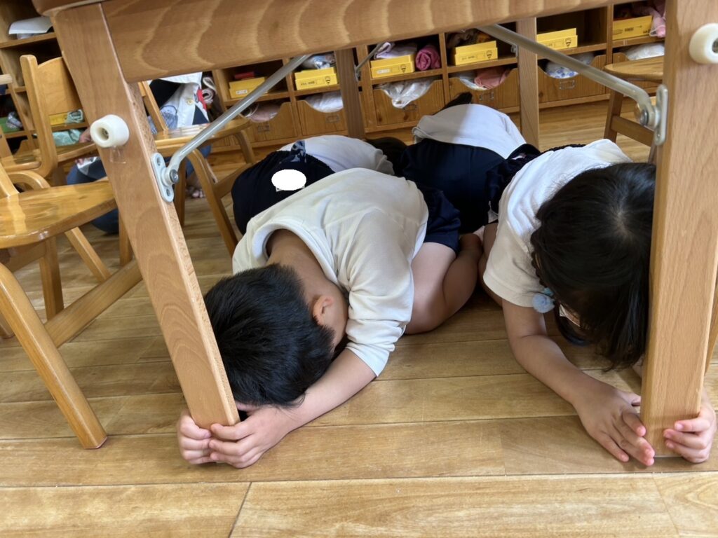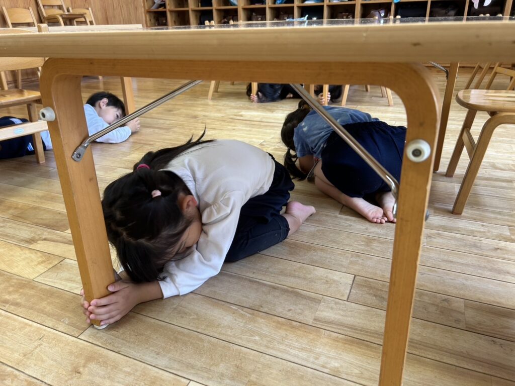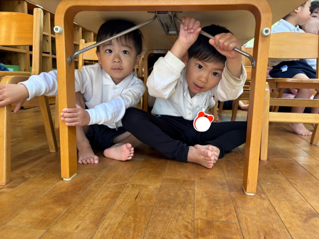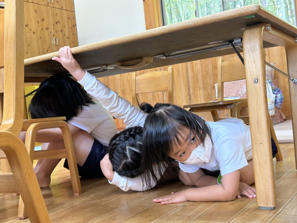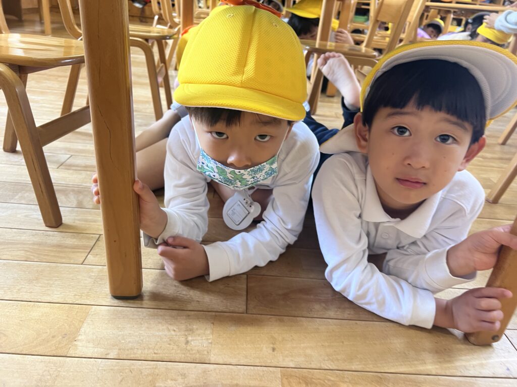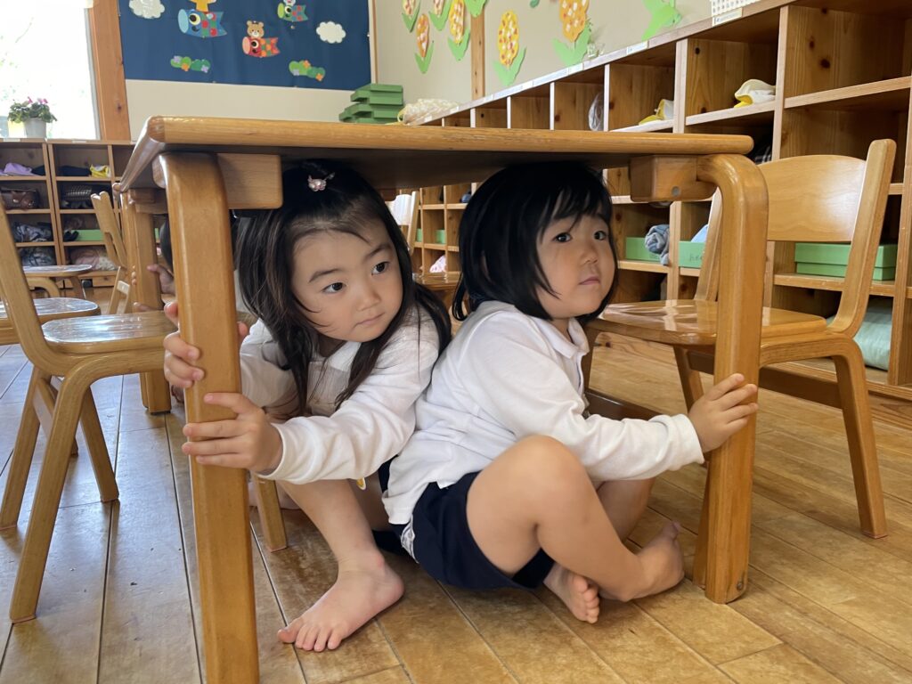 保育室で避難の方法を聞いたり、実際に地震の放送を聞いて机の下に潜ったりすることができました。「机の脚を持つといいよね」「大事な頭を手で守ると良い!」と、昨年までの経験を生かして避難訓練に臨む、進級児の姿勢も見られました。