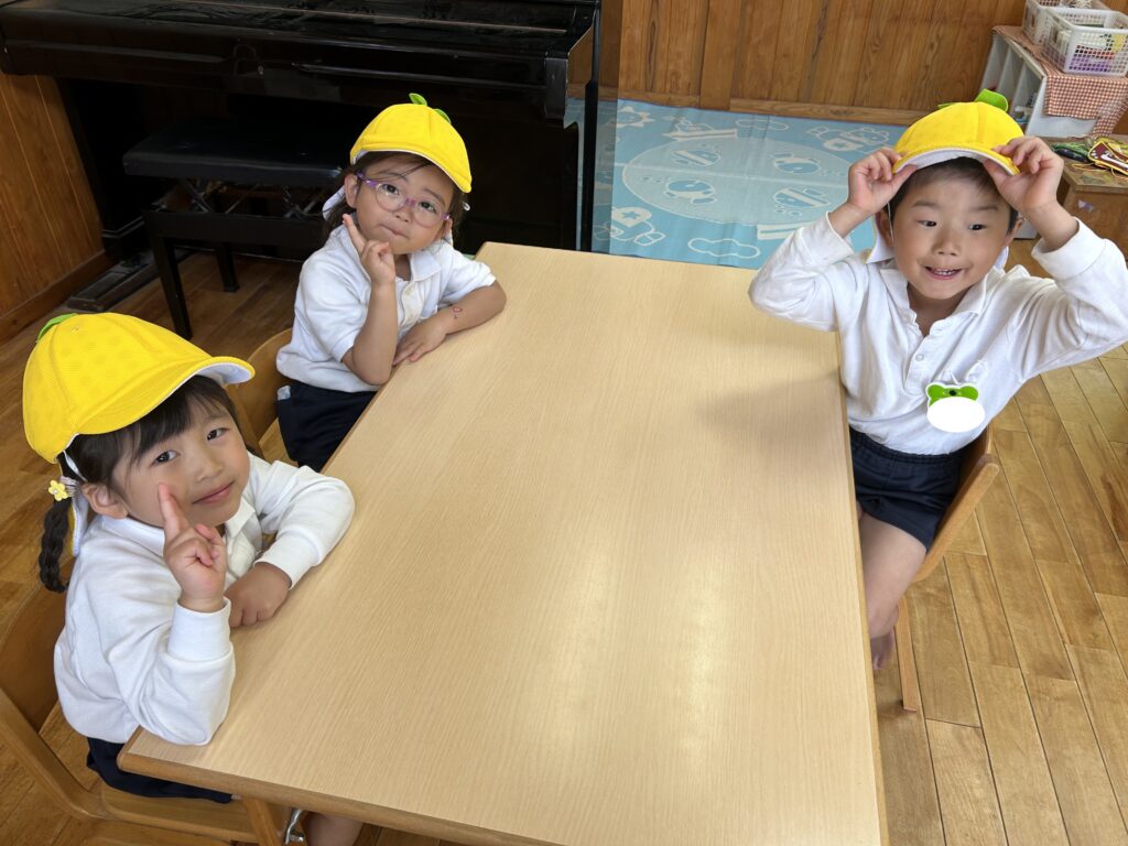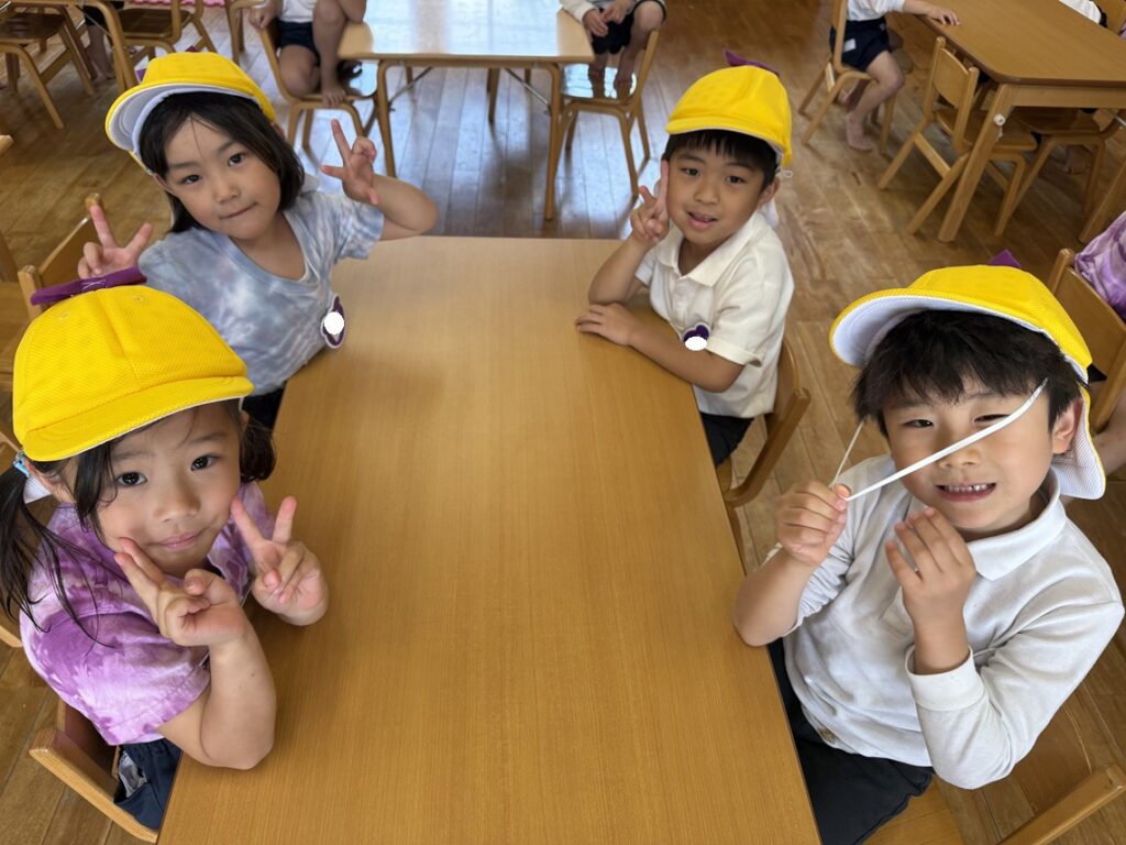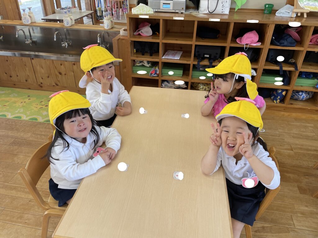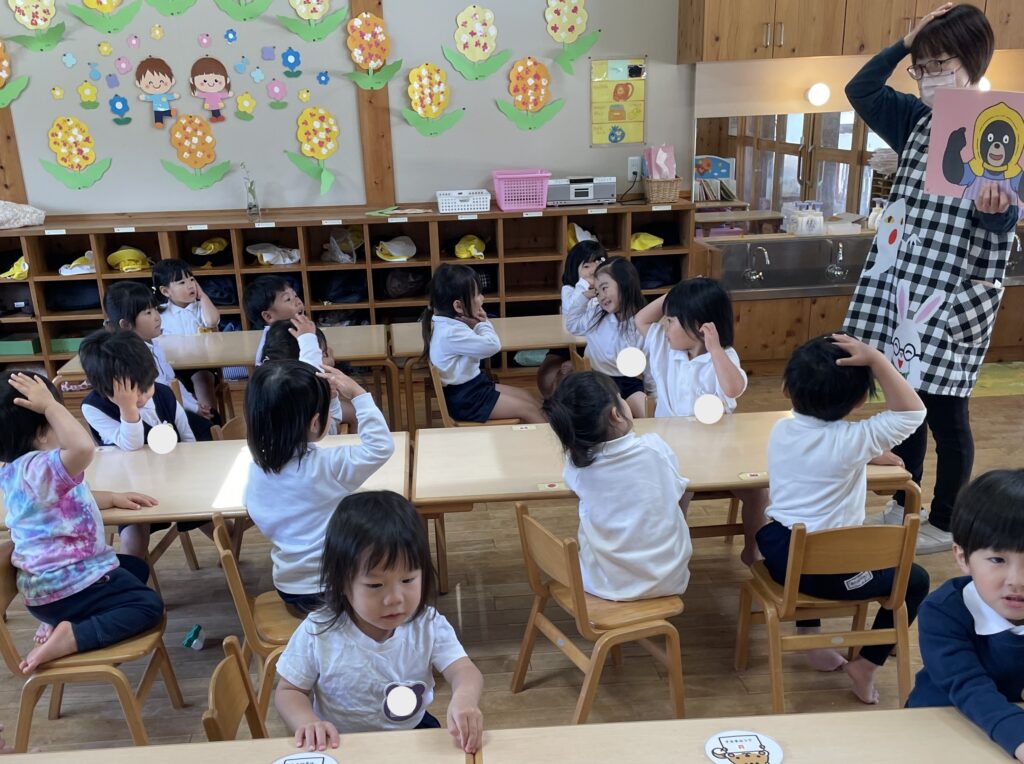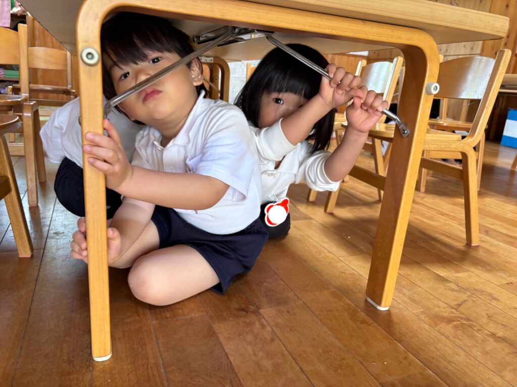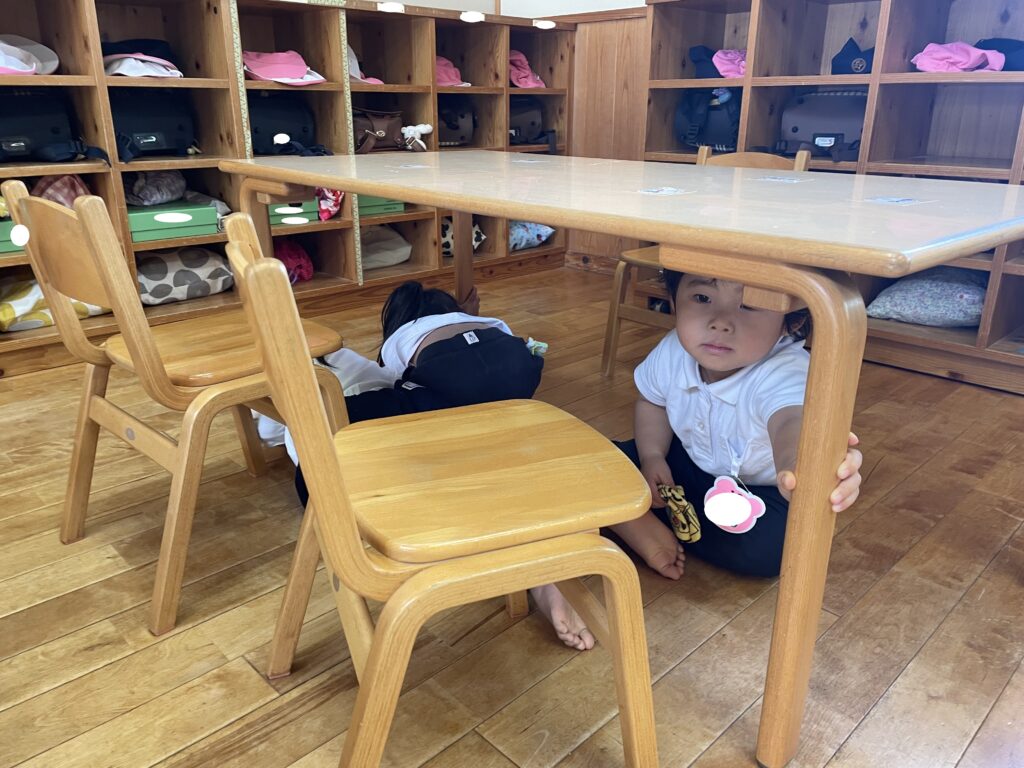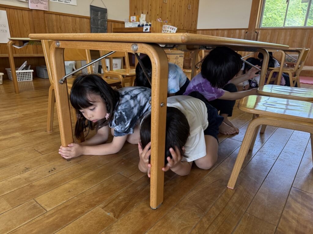 保育室で避難の方法を聞いたり、実際に地震の放送を聞いて机の下に潜ったりすることができました。「机の脚を持つといいよね」「大事な頭を手で守ると良い!」と、昨年までの経験を生かして避難訓練に臨む、進級児の姿勢も見られました。