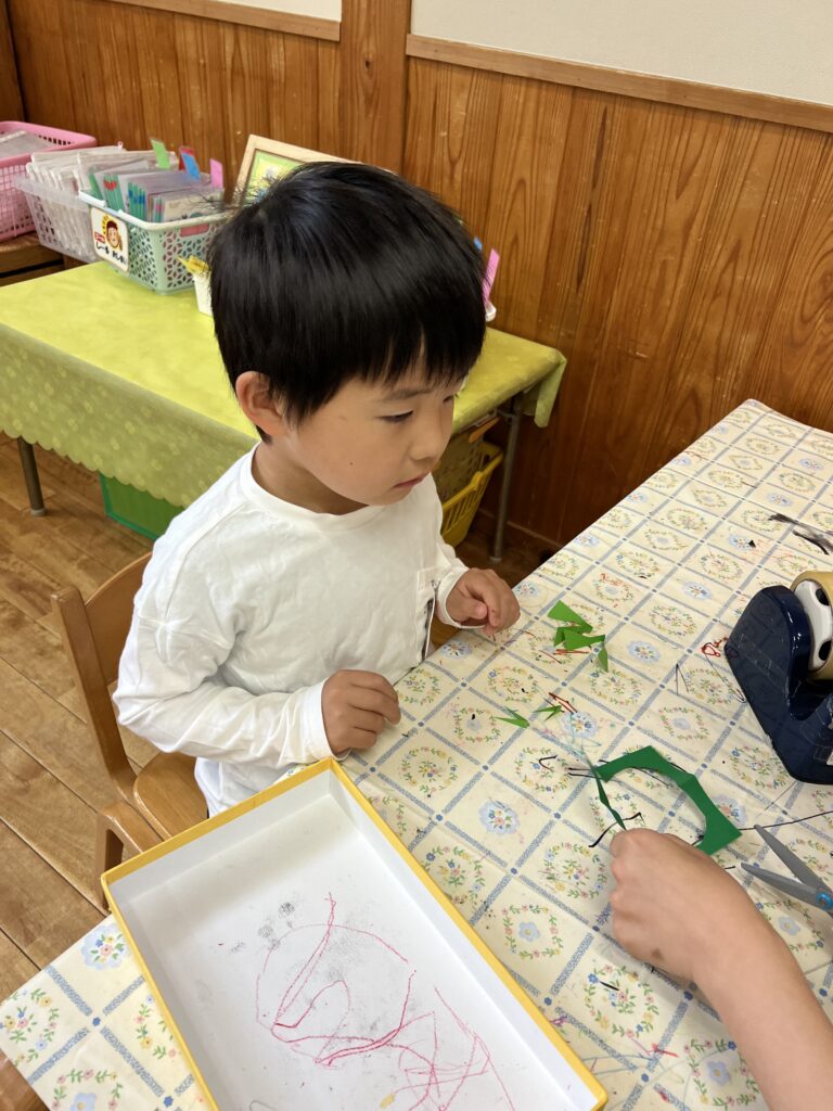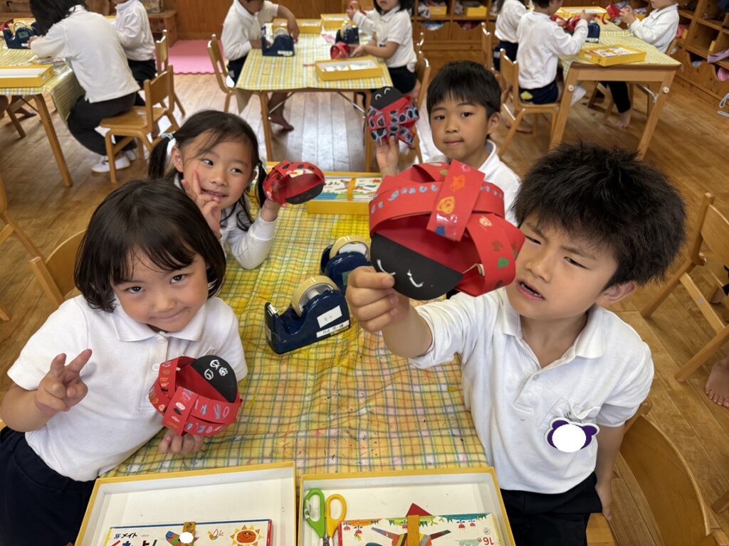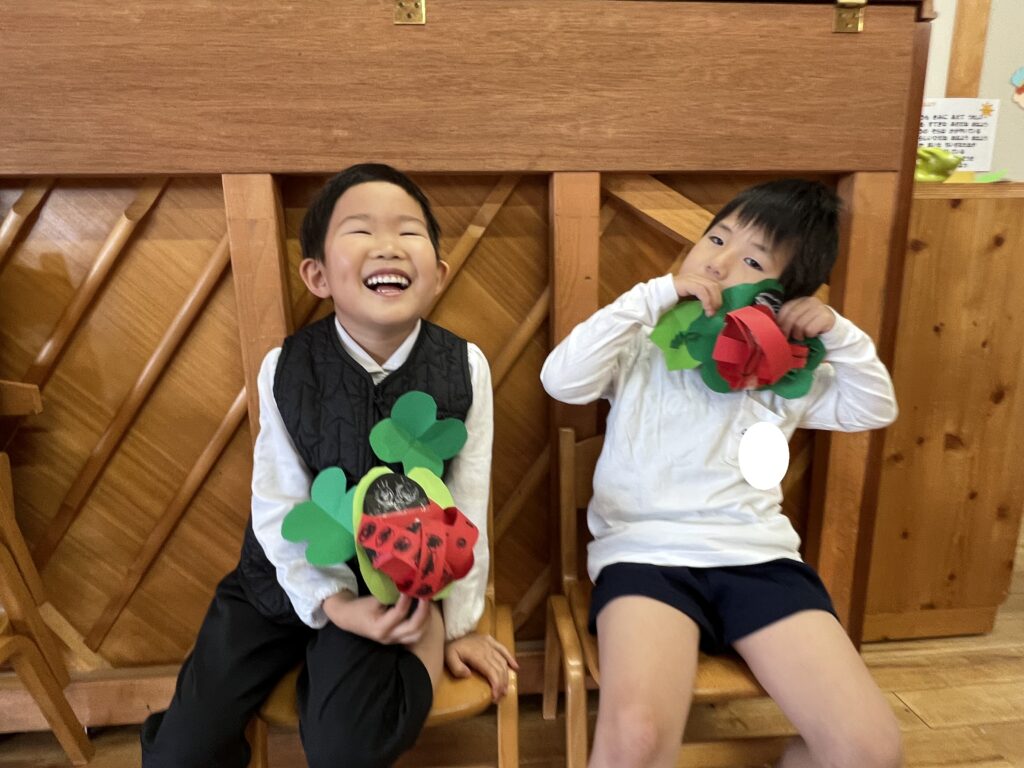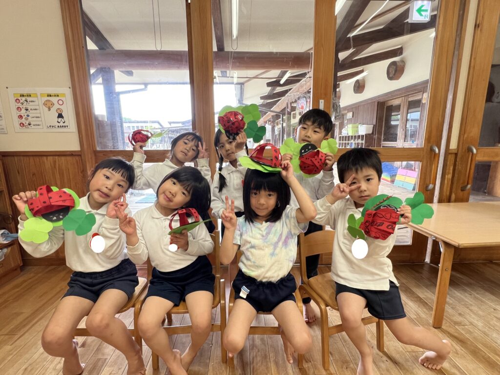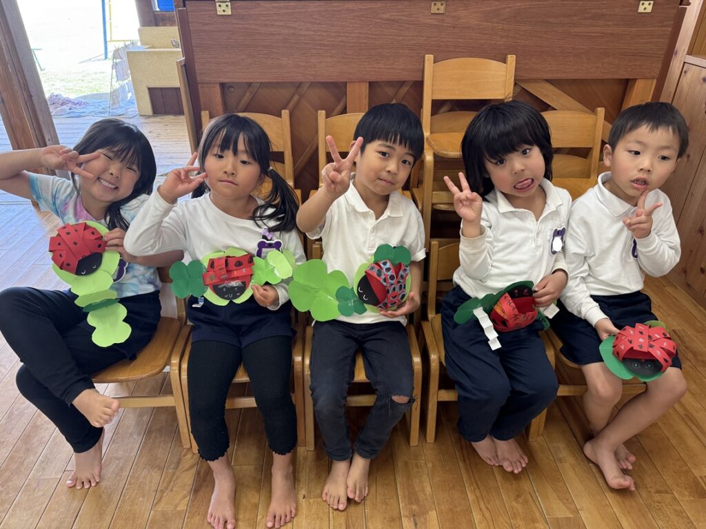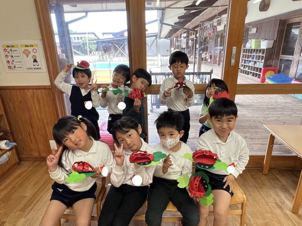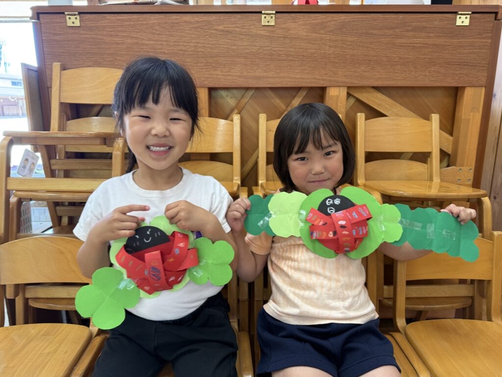 5月の製作として、テントウムシを作りました!立体のテントウムシ作りに少し苦戦していましたが、できた時の表情はとても嬉しそうで、達成感は大きかったようです!四つ葉のクローバーも、丁寧に頑張って作りました!これからもいろんな製作をしようね!!