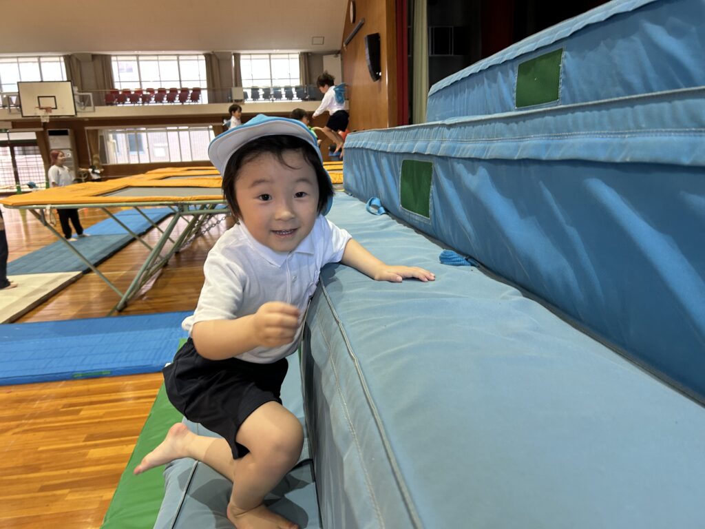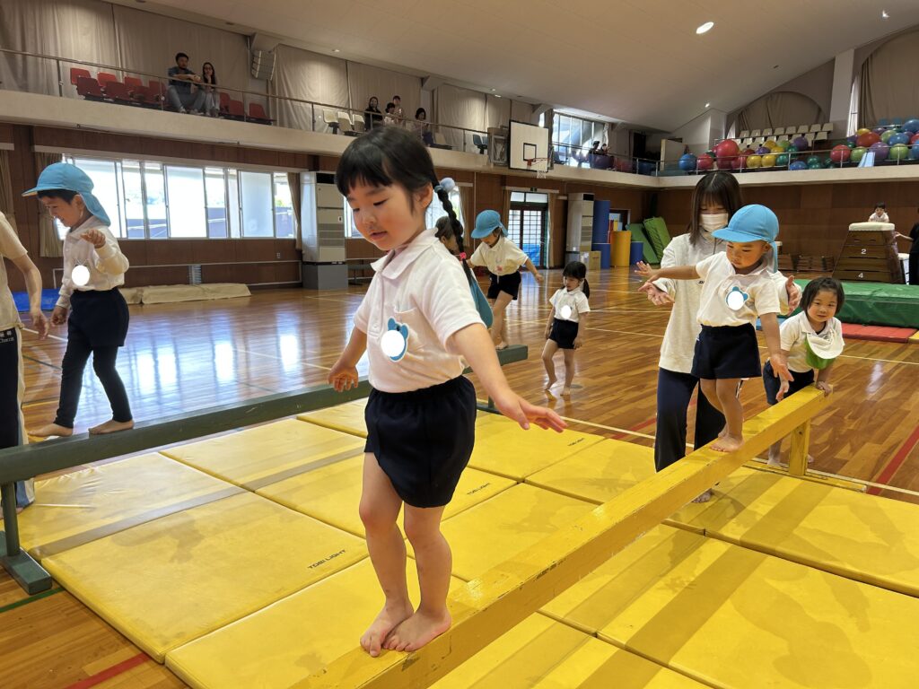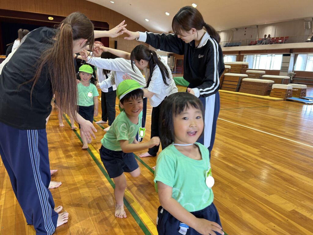 子どもたちは、平均台やトランポリン、ボール投げなど、いろいろな運動遊びを学生のお姉さんと一緒にできることに大喜びで、楽しんで行う姿が見られました(^▽^)/