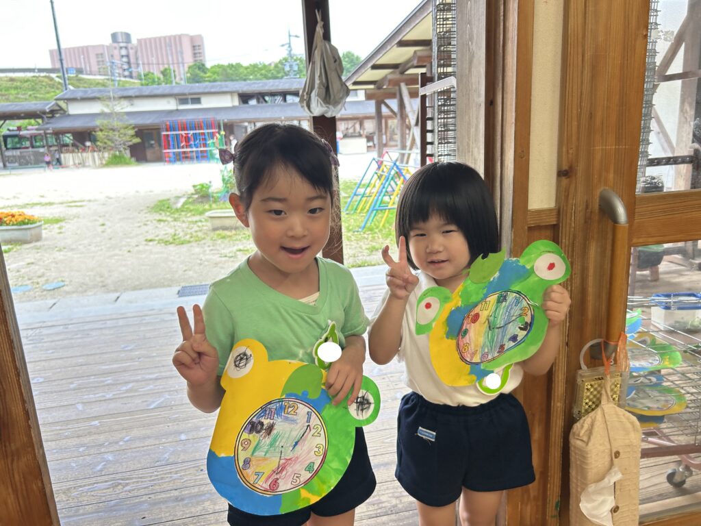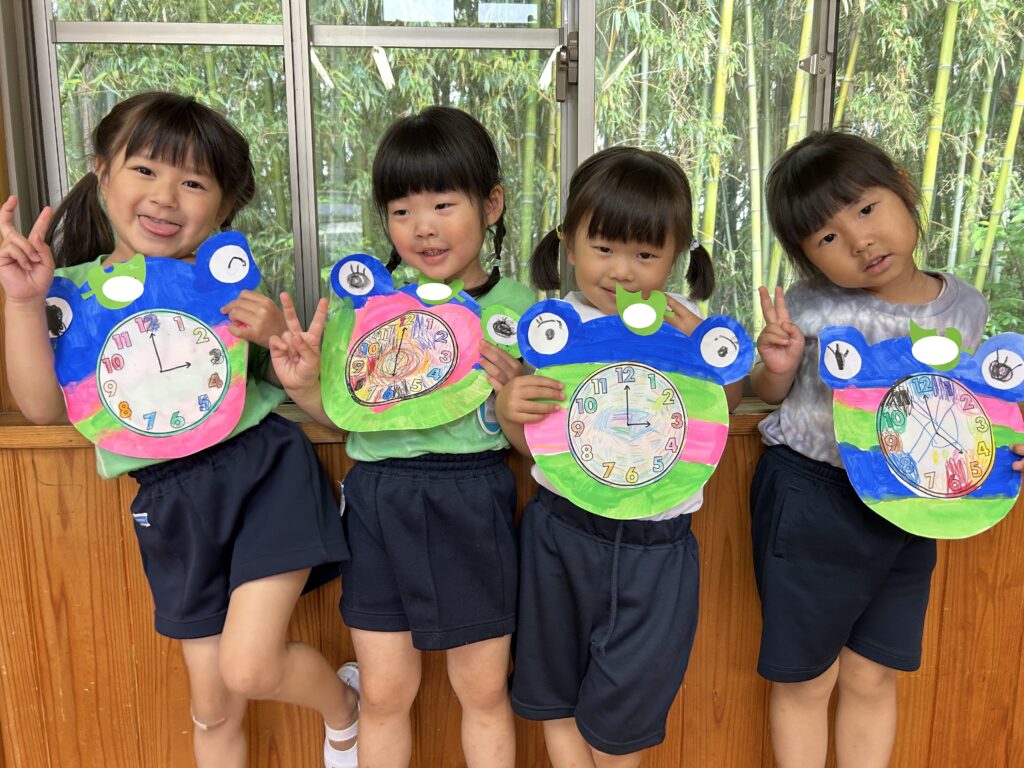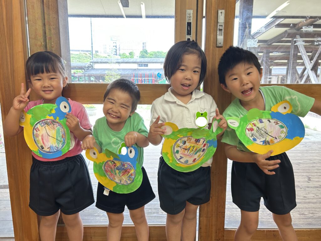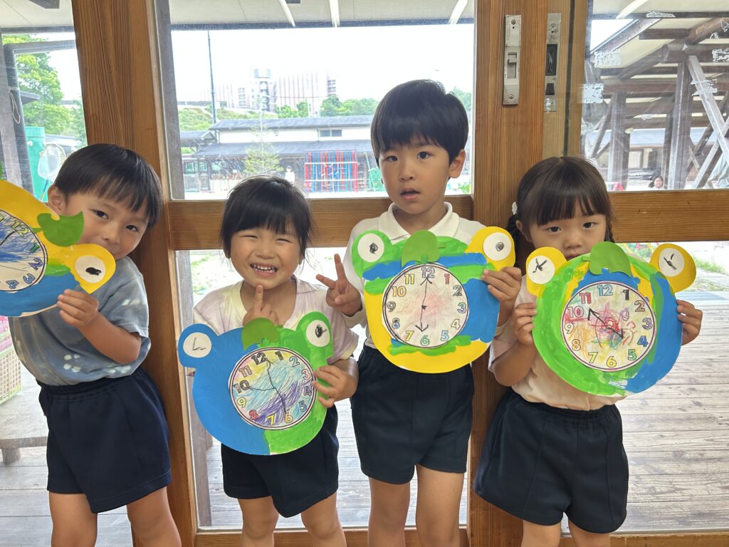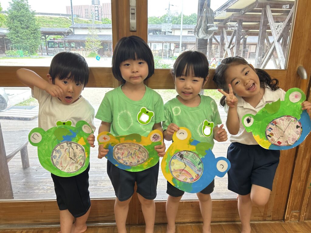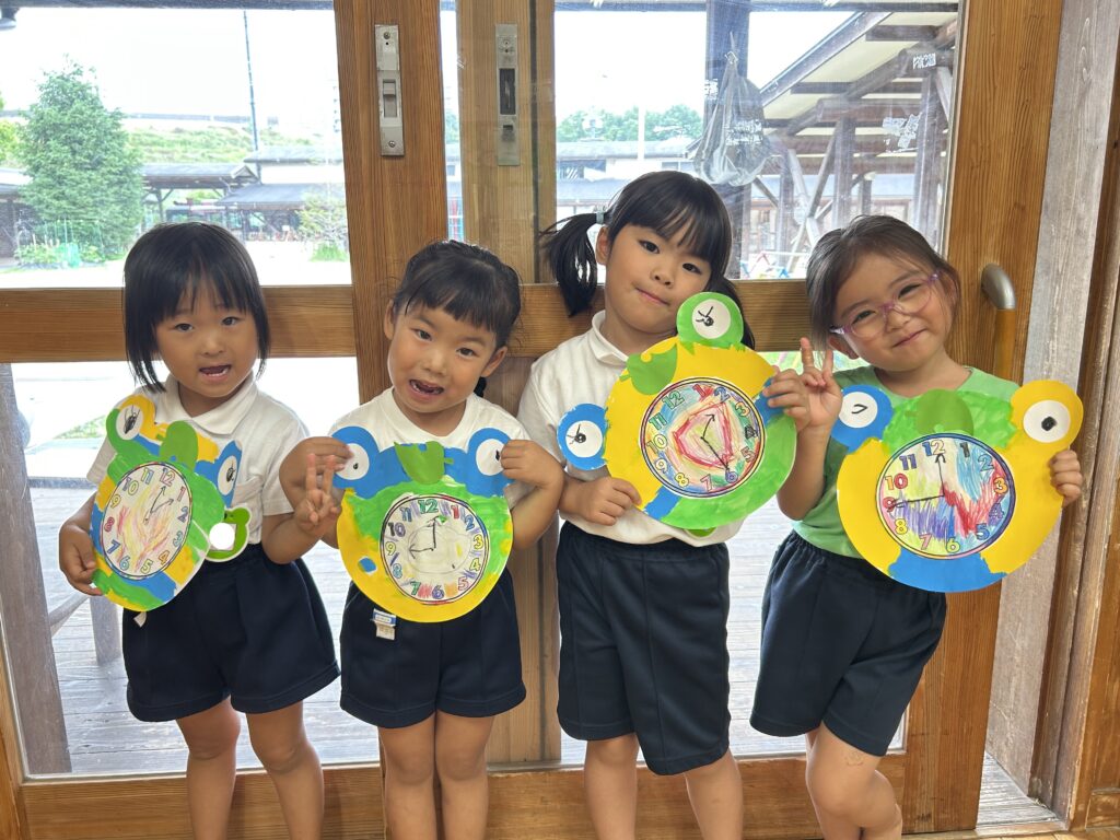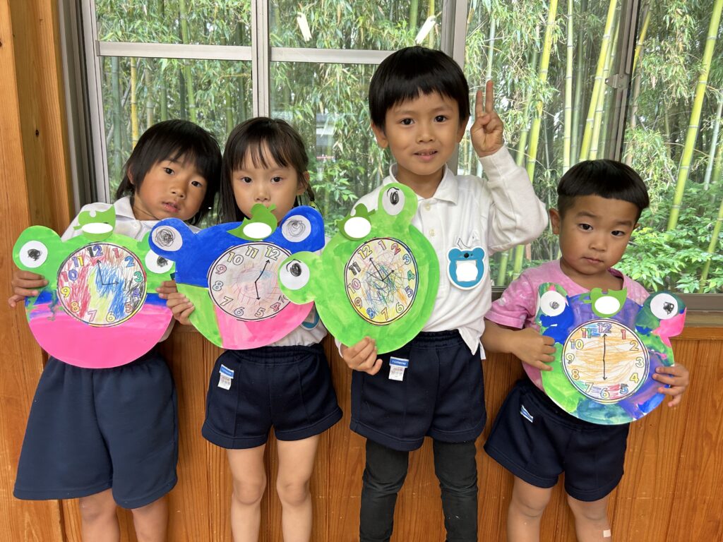 絵具でカエルの模様を描いたり、文字盤を色鉛筆で塗り、はさみで形に添って切ったりして、丁寧に作ることを楽しみました!