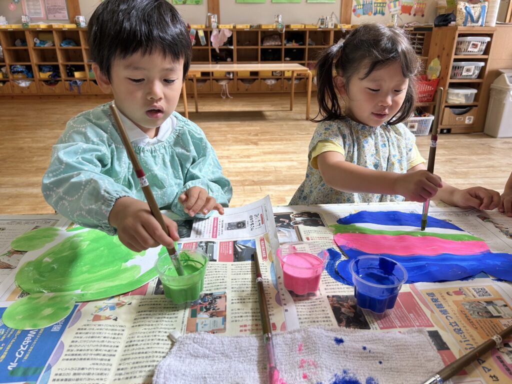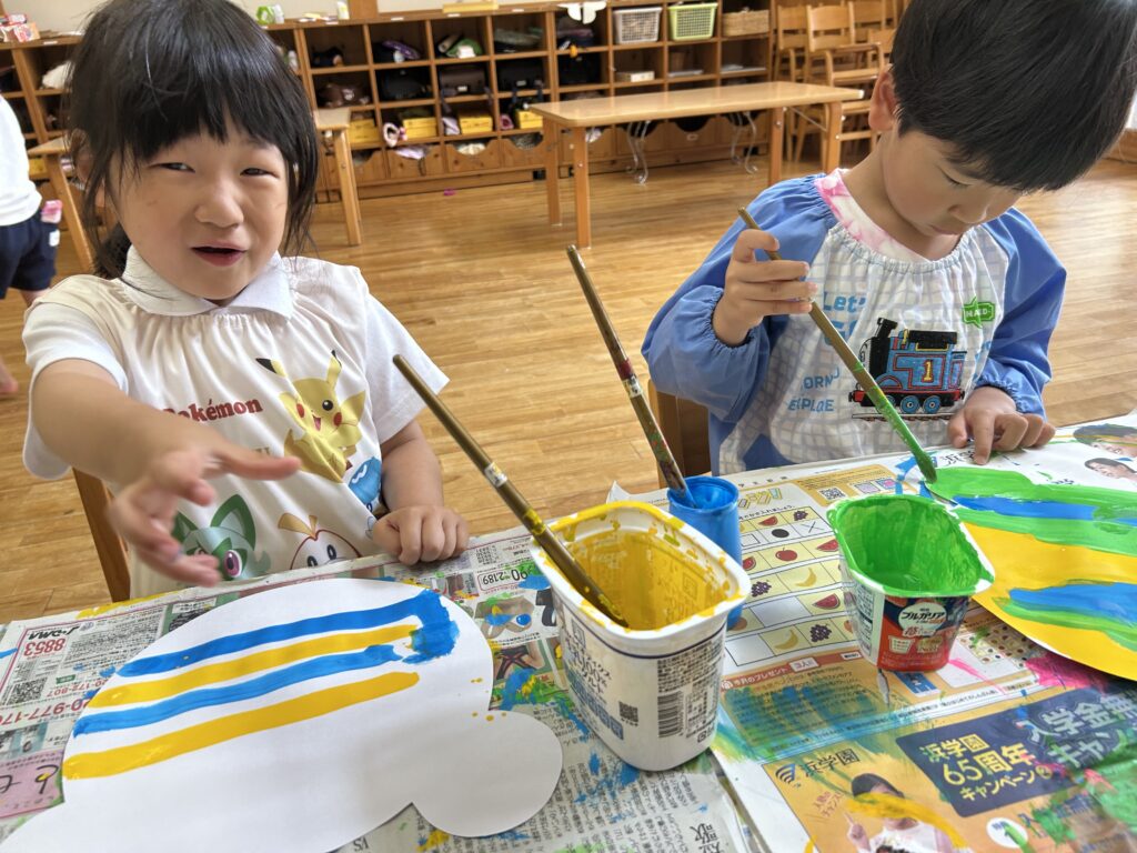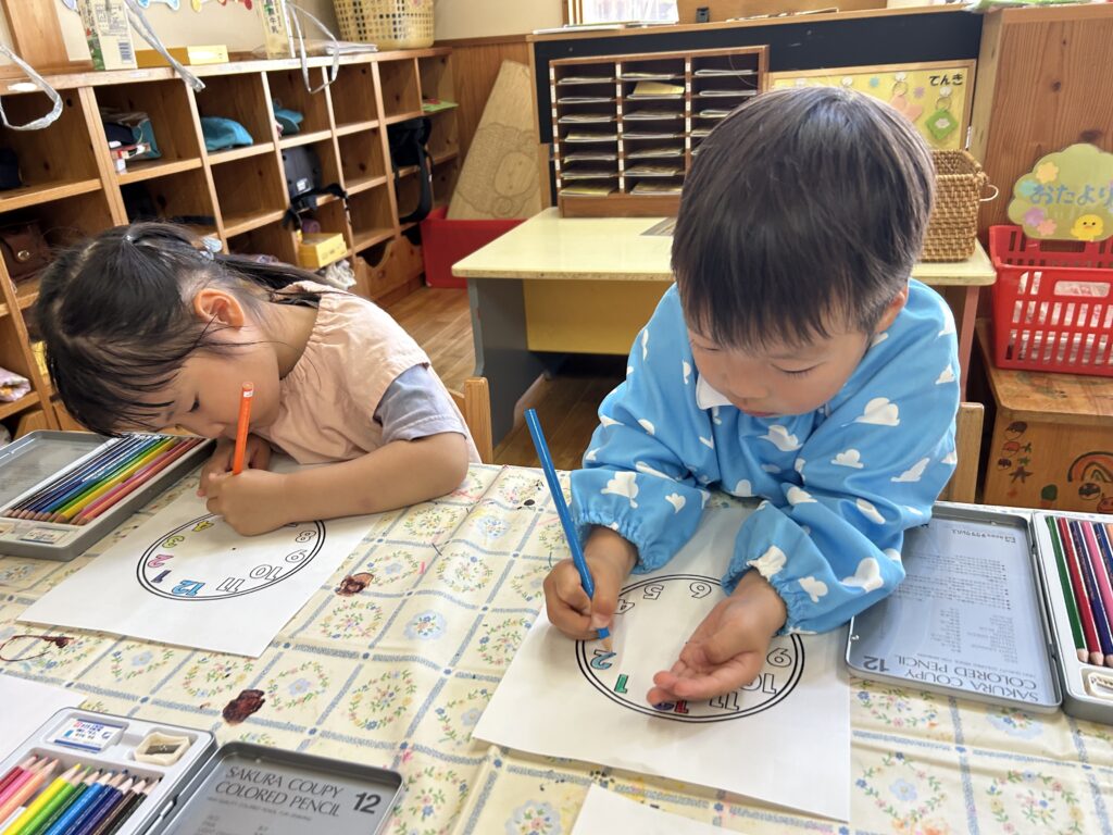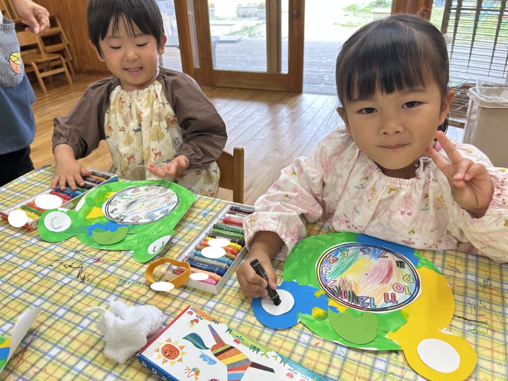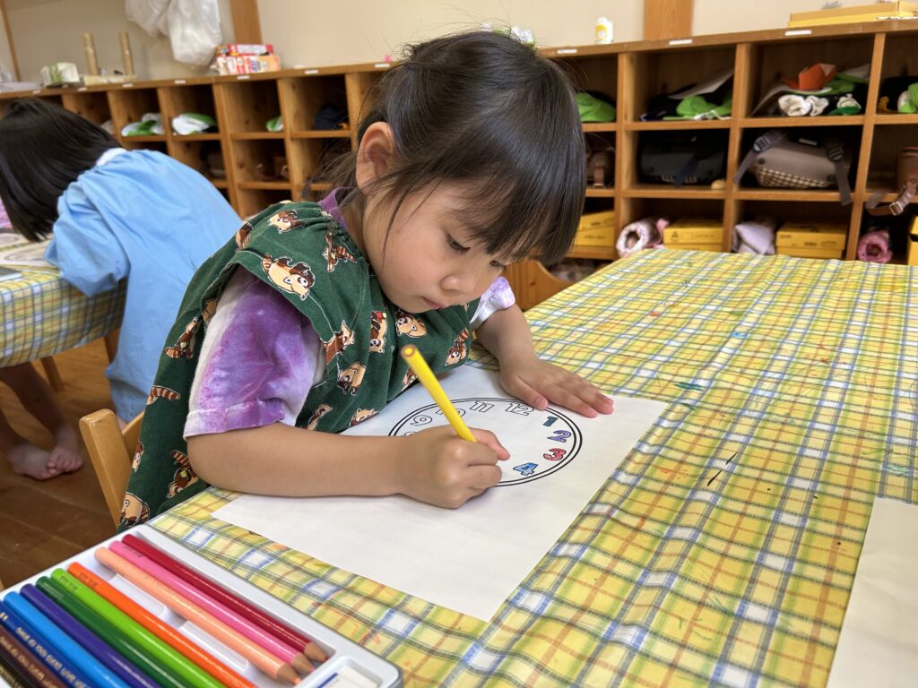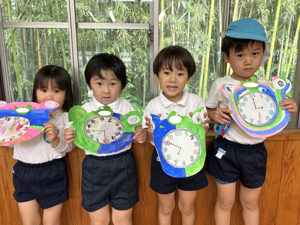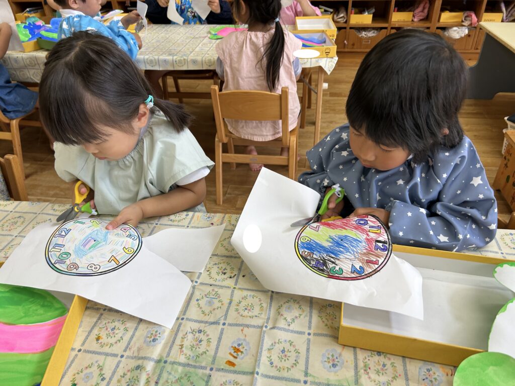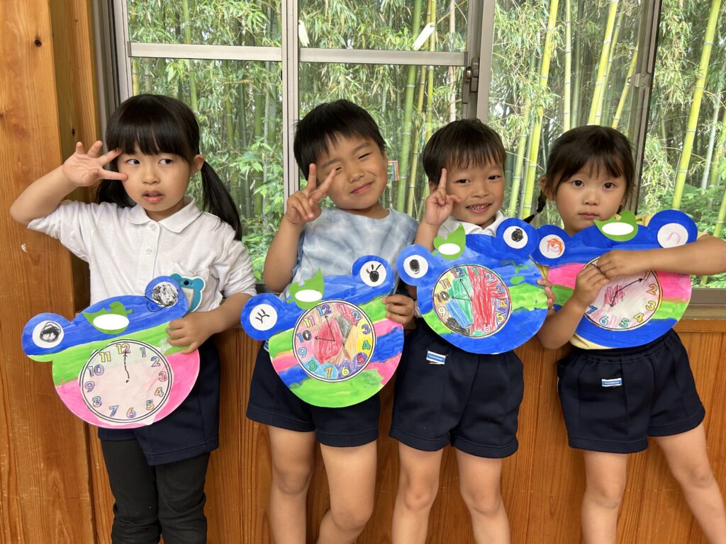 絵具でカエルの模様を描いたり、文字盤を色鉛筆で塗り、はさみで形に添って切ったりして、丁寧に作ることを楽しみました!