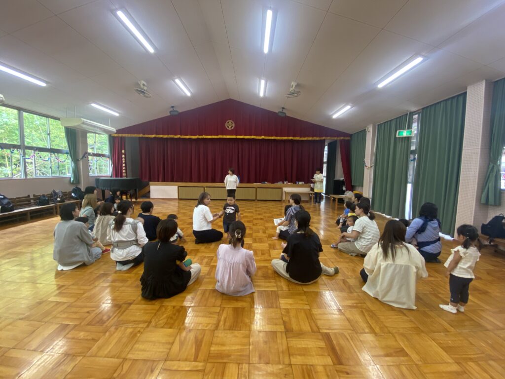 最初に園長先生のお話や担当の先生の自己紹介を聞きました。お母さんと一緒に上手にお話が聞けました。
