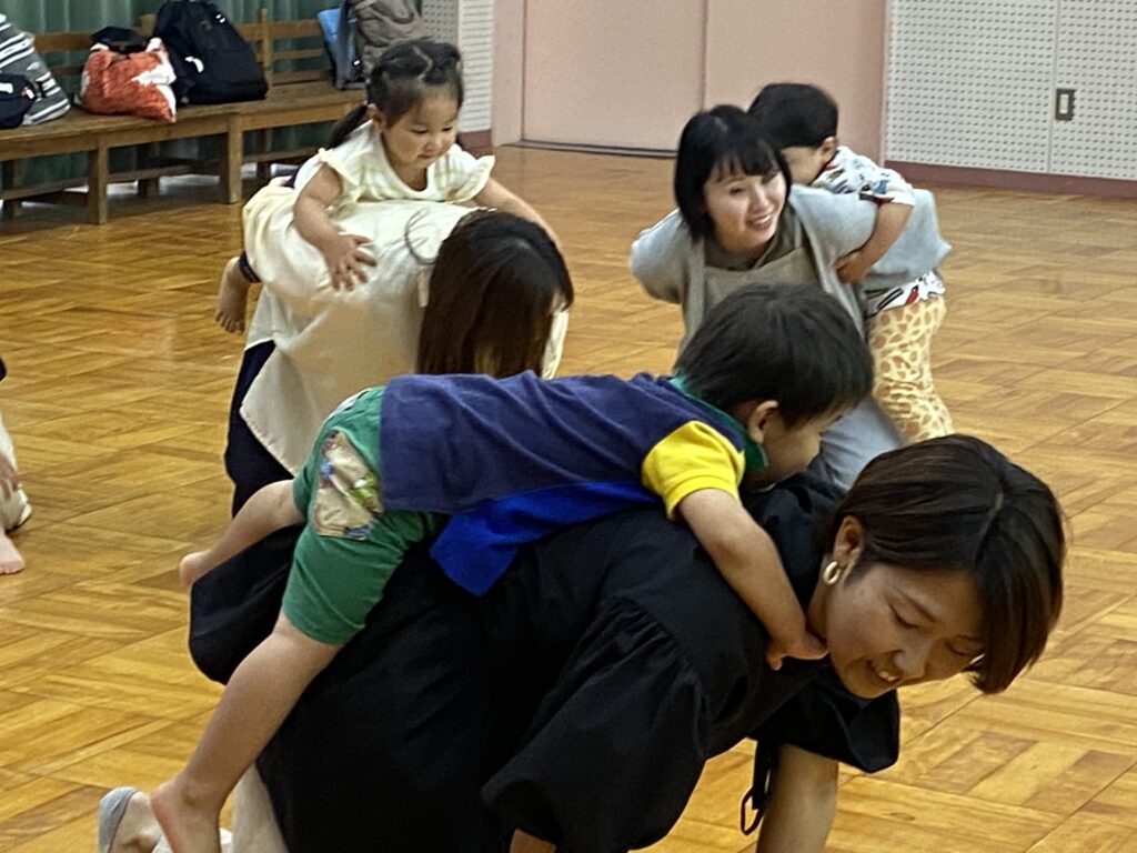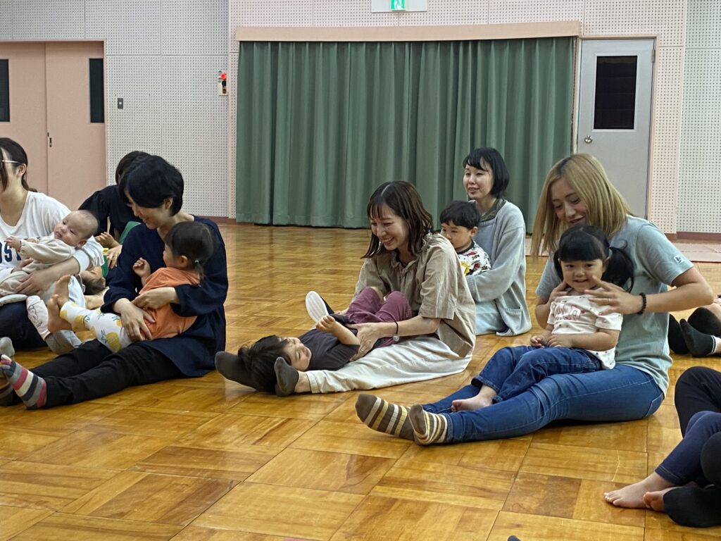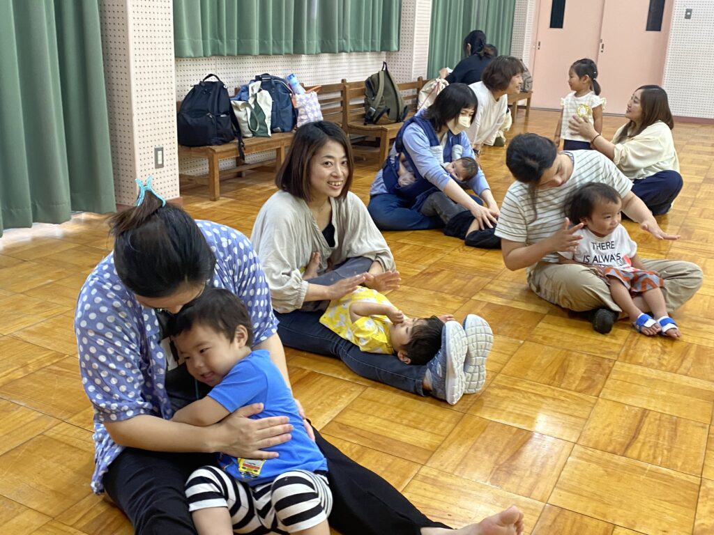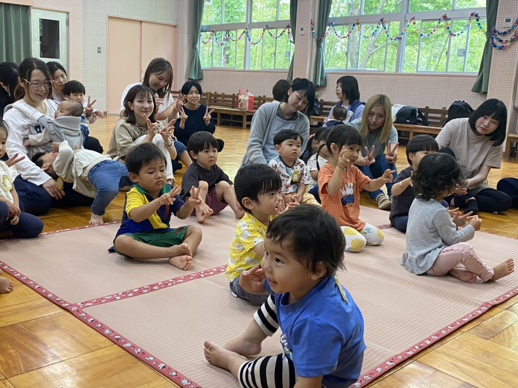 親子で体操とふれあい遊びをしました。歌に合わせてお母さんとたくさん触れ合ったり、元気に体操ができました♪