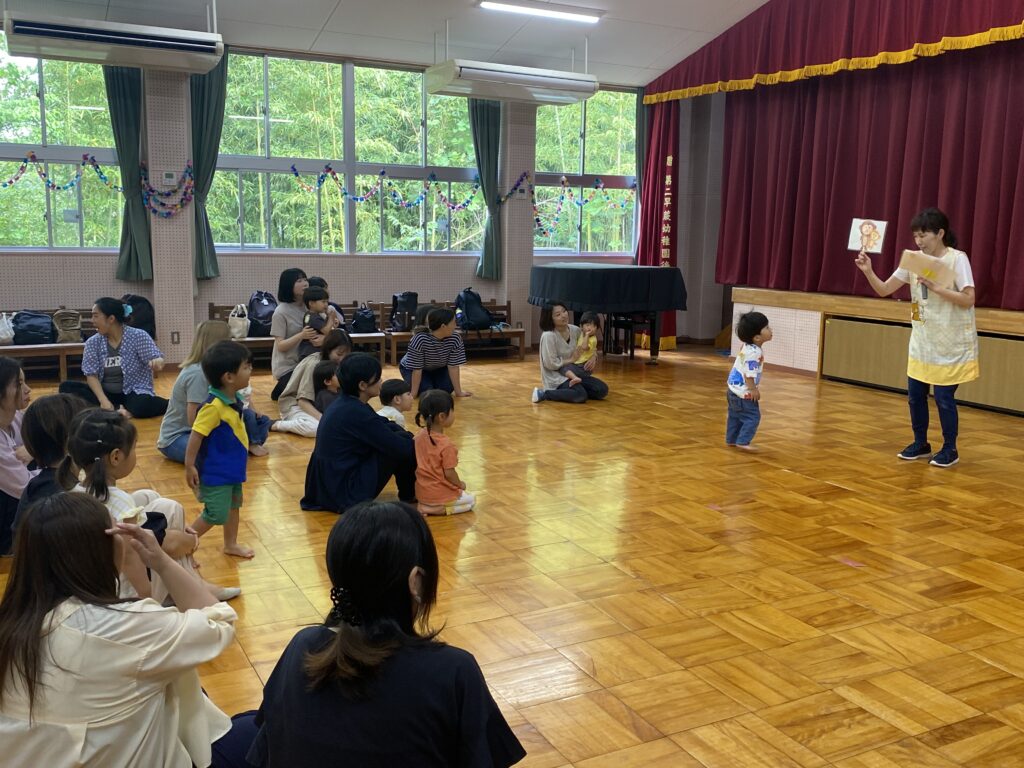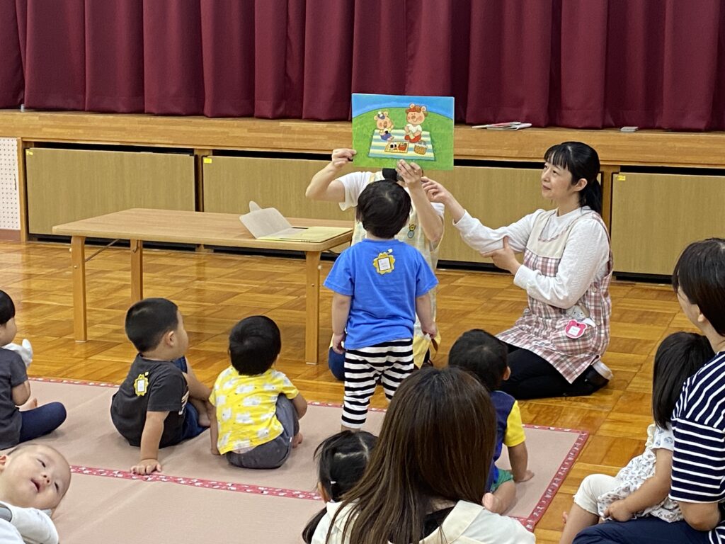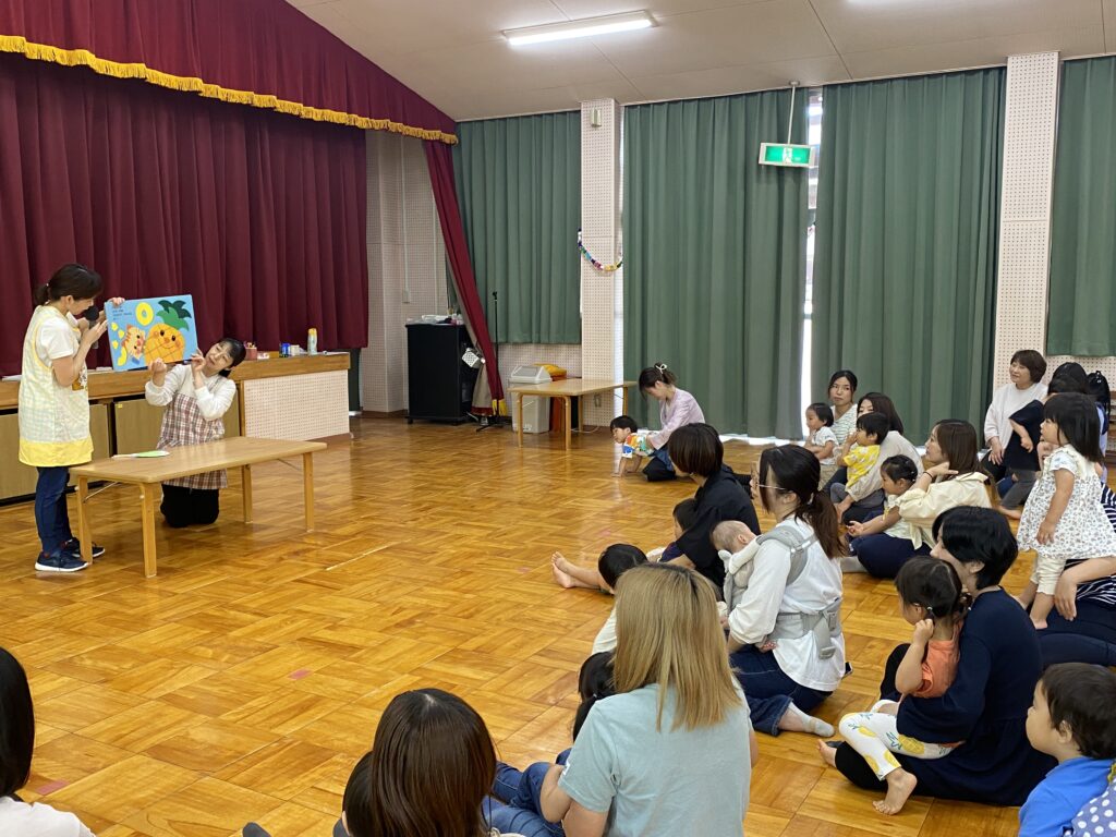 最後に手遊びと紙芝居を見て、お菓子とジュースをもらってみんなニコニコで広場が終わりました。